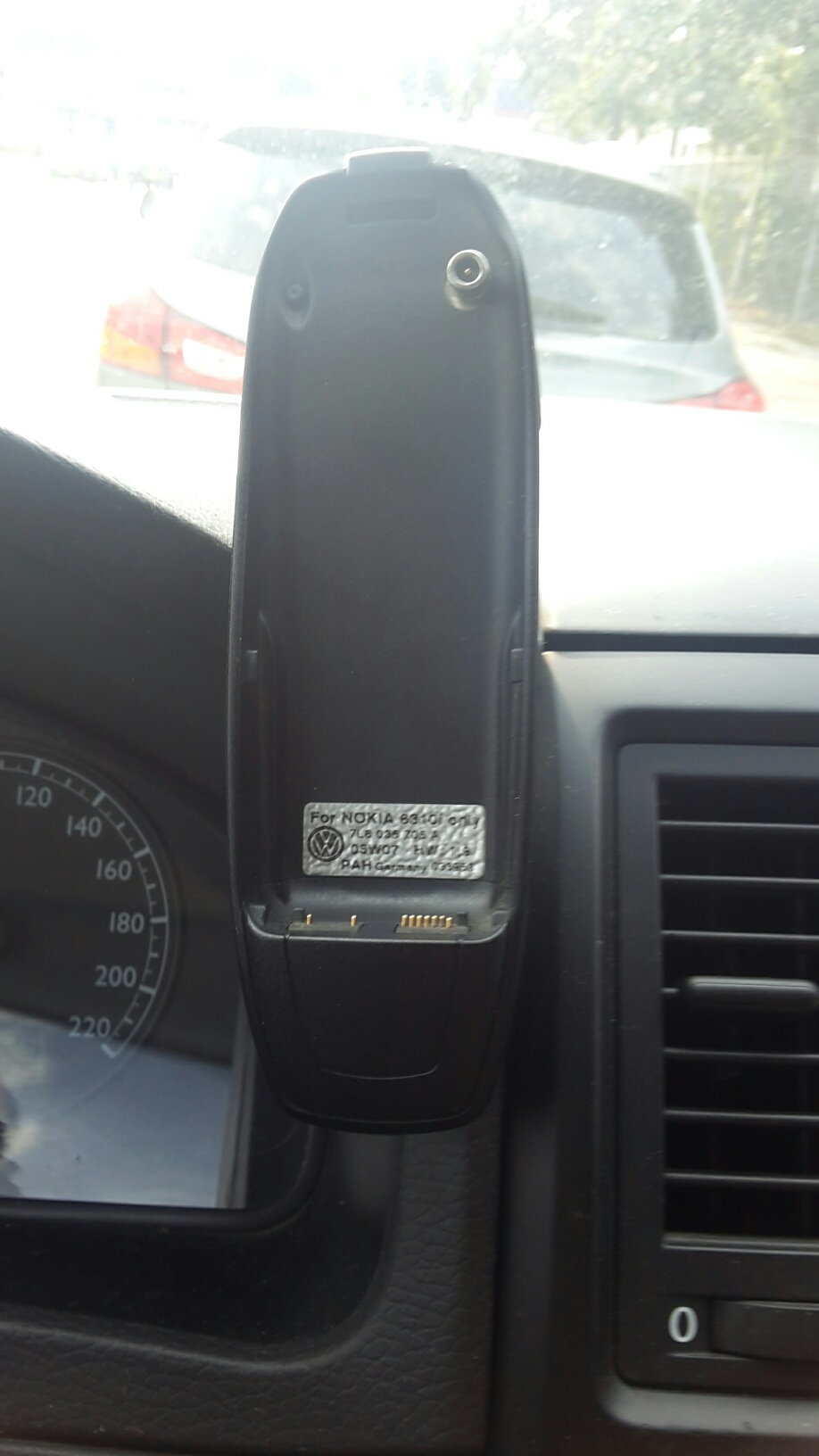 In mijn T5 zit deze telefoon-cradle ingebouwd. Het is een soort algemeen verbindingsstuk (onderste foto) met daarop een houder voor een Nokia 6310. Ik heb zelf een Samsung Note.