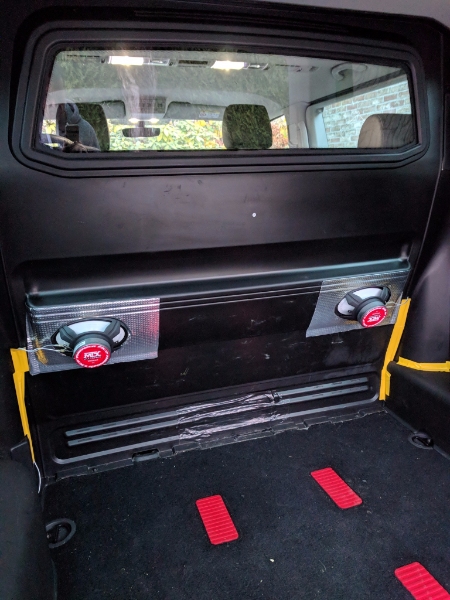 Sietse, ik ben bang dat ik toch te veel van de hoge tonen ga missen bij het monteren van de speakers op de locatie zoals ze bij jou bus ingebouwd zijn. Maar het is dan wel weer een voordeel dat ze niet in het zicht zitten vanuit de cabine. Het is naar mijn mening namelijk best een nadeel dat er geen standaard inbouw mogelijkheden zijn voorbereid in de dubbele cabine.