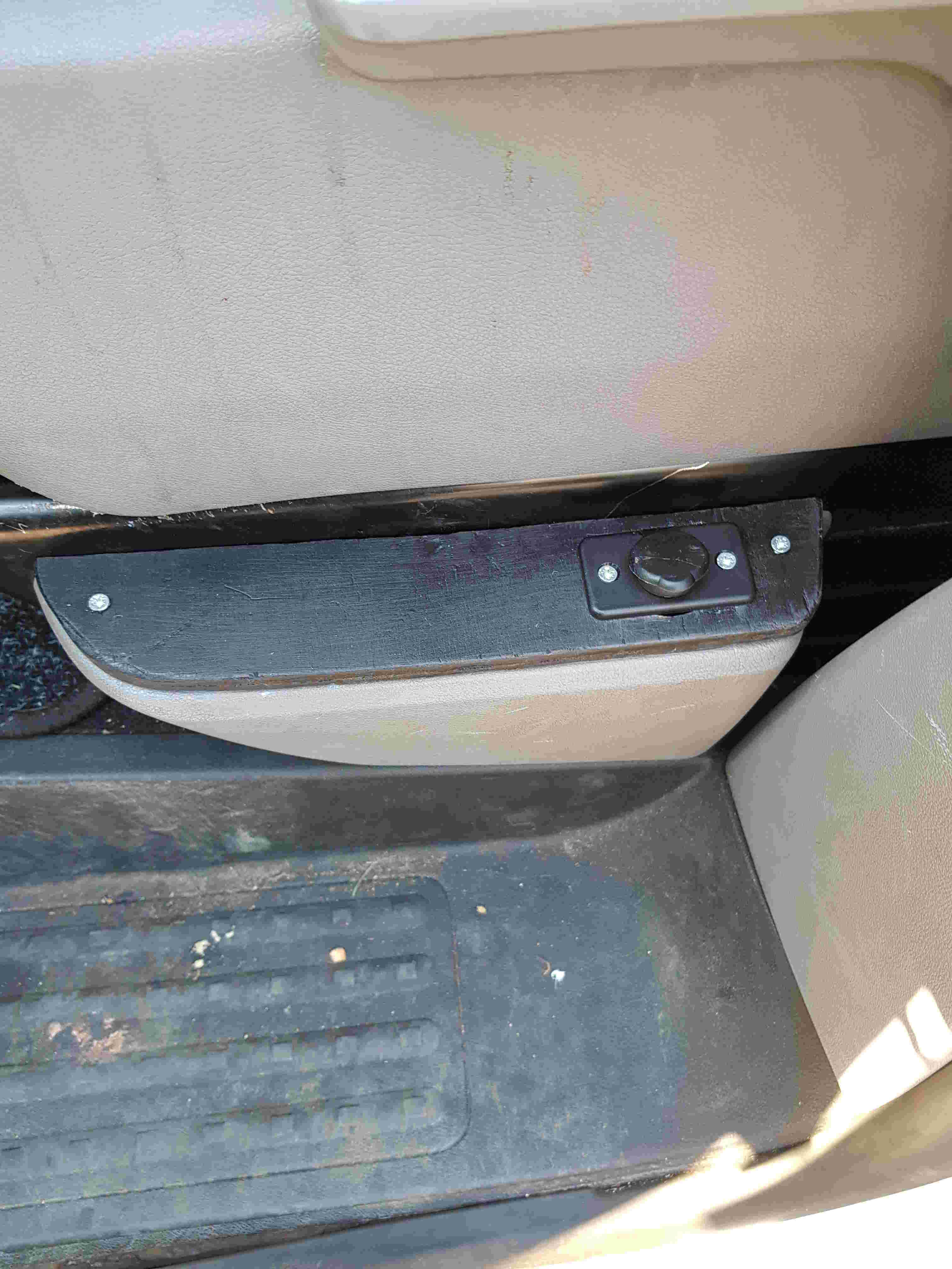 (jaja, het gat is te groot geboord, als ik alles van de bus af heb maak ik een nieuw plankje met kleiner gat..) Onderin de stoel heb ik een plankje op maat gemaakt om de onderdelen op te monteren.