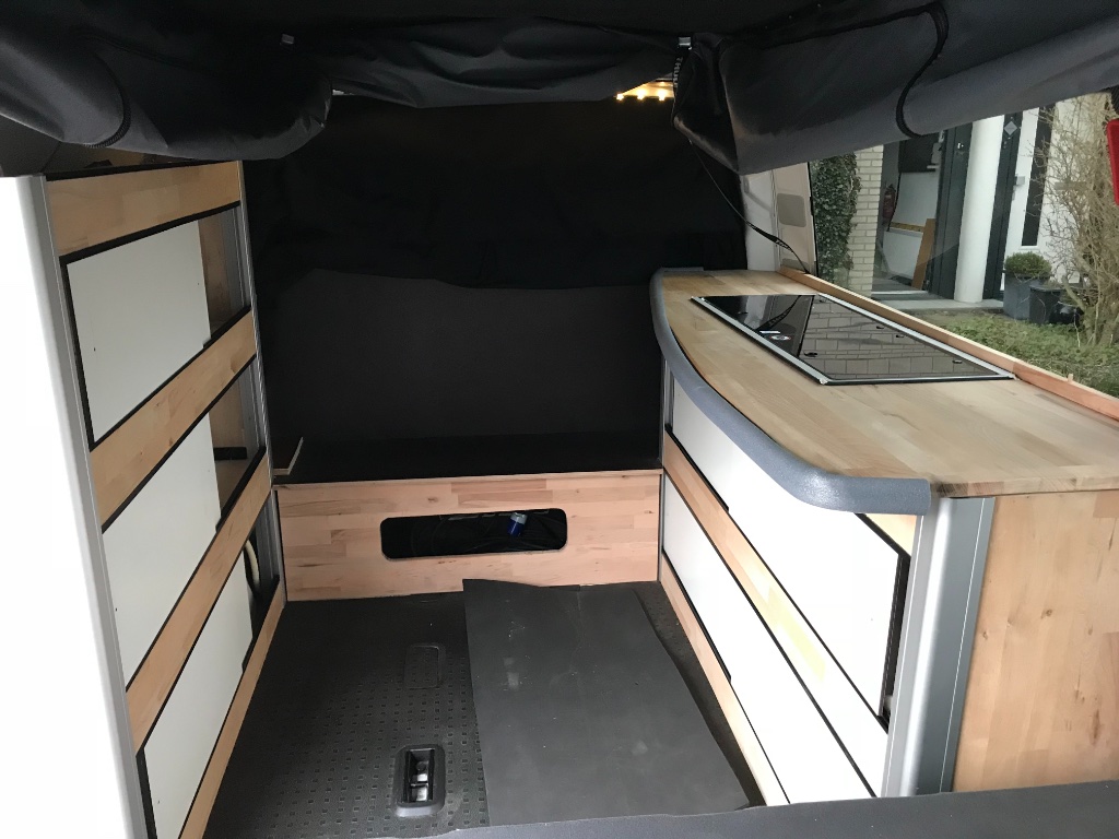 Daarna werd gezocht naar een hefdak waar ook 2 volwassenen zouden kunnen slapen. Deze is gevonden bij FSL. Met als detail om het hefdak andersom te plaatsen dus met het hoogste gedeelte achter.