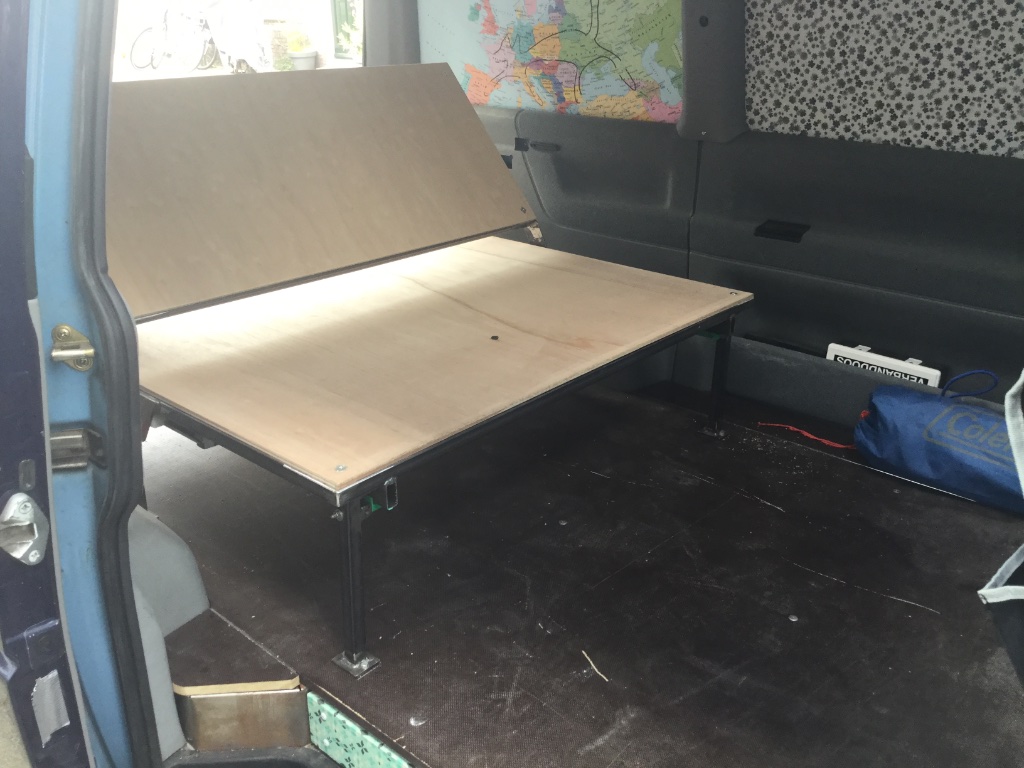 Ik ben begonnen met een stel pootjes te monteren die niet veel afbraak doen aan de laadruimte tussen de wielkasten. Hier kan ik via de achterklep een bedbodem inschuiven, en daarachter schuif ik dan een 2 delige bodem om er een volwaardig bed van te maken. Die 2 delige kan ik weer omhoog klappen en met de grote bodem naar achter geschoven is het dan een bankje . Alle vergrendelpuntjes moet ik nog maken maar we kunnen in ieder gevel het matras uit de logeerkamer weer kwijt aankomende week en de spullen er onder tetrissen.