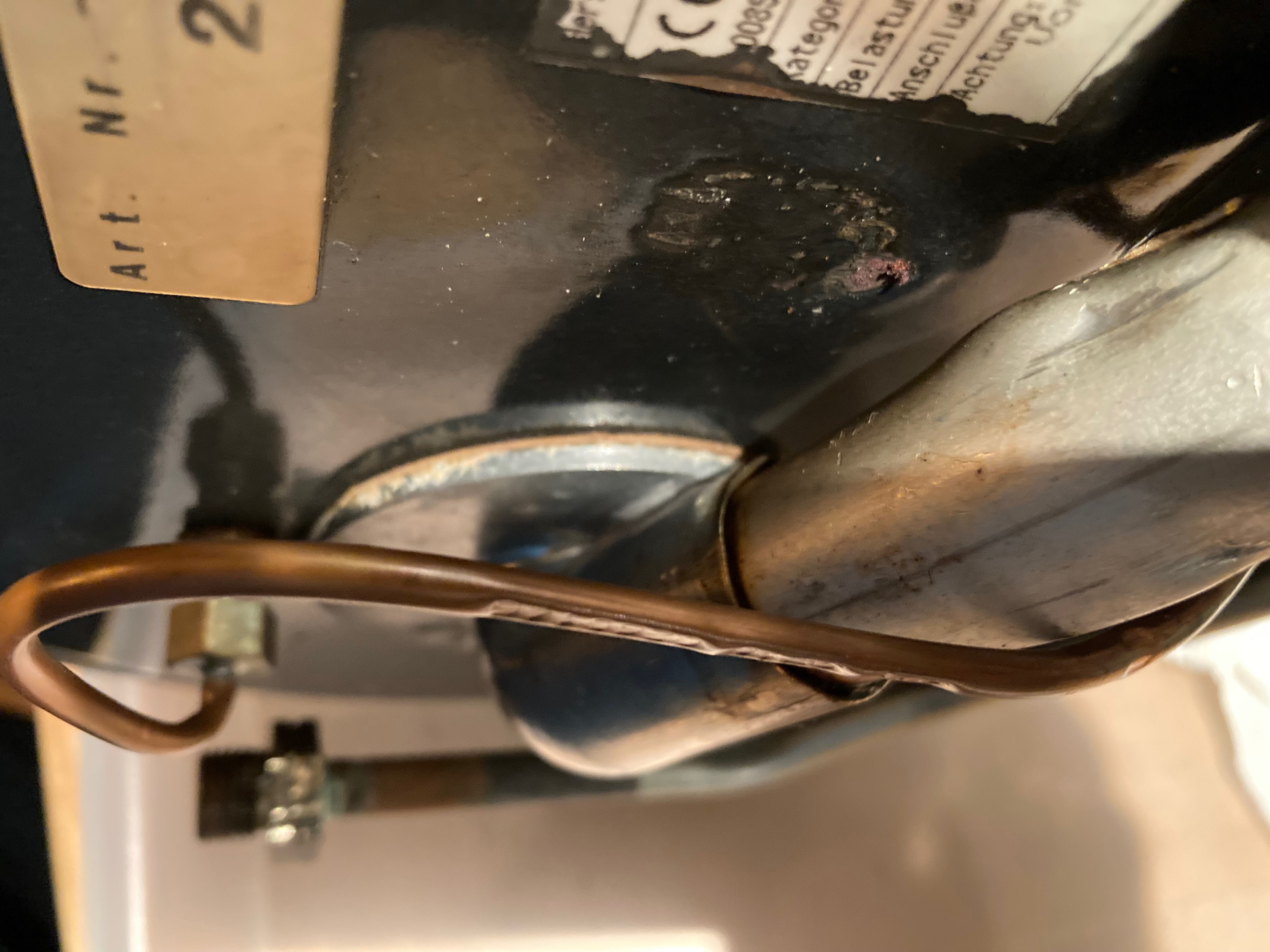 De branderkop is natuurlijk gesmolten en onbruikbaar en de RVS onderplaat is kromgetrokken. Bij de demontage van de andere brander kwamen de resten van de originele pakkingen in brokjes eraf vallen.