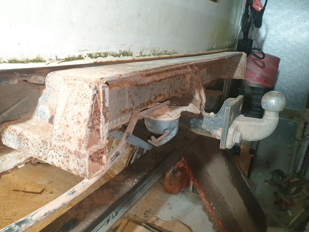 Nu ik alle hitteschilden en schermen er onder uit heb zie ik dat ik in ieder geval bij twee van de 3 dwarsbalken de middelste versterkingen er af fabriek op zitten. Ik moet bij de voorste balk de 4 grote hoekijzers monteren en langs het chassis de losse hoekjes en beugels. Dat scheelt al weer een paar uur slijpwerk.
