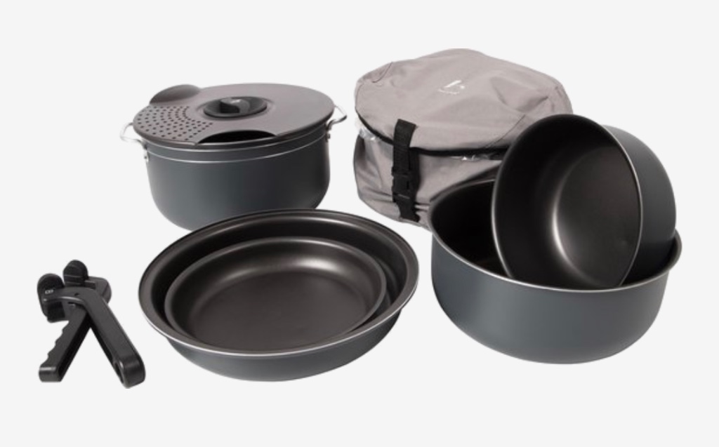Wij hebben ons Tefal campingpannensetje van de tent meeverhuisd naar de camper, wel aangevuld met een “echte” koekenpan. Al meer dan 30 jaar in gebruik. Onze uitvoering wordt nu niet meer door Tefal geleverd, er is wel een kopie van bo-camp.