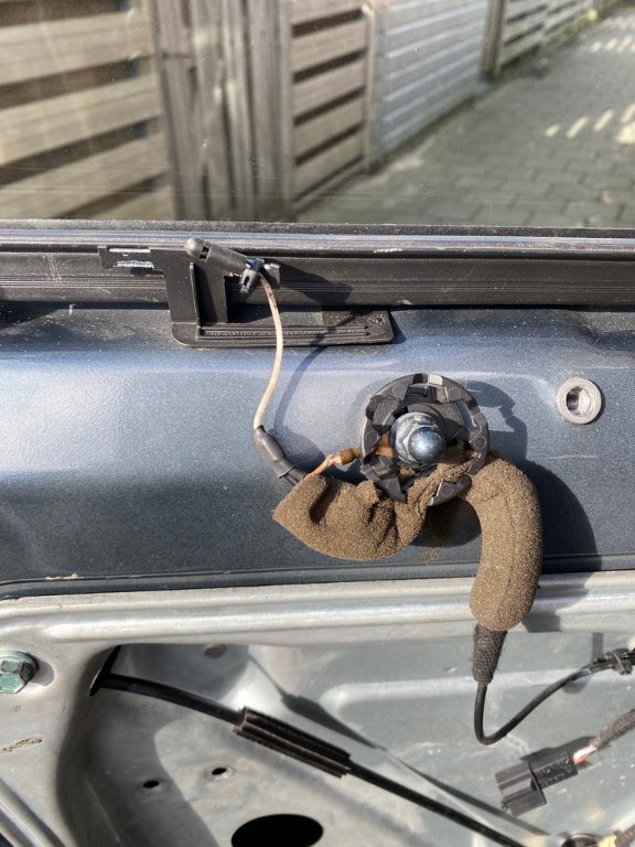Met veel moeite de deurbekleding eraf gekregen. Vorige eigenaar had een gedeelte vast gelijmd waardoor de twee bovenste schroeven niet te bereiken waren.