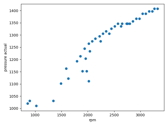 In de log die ik nu heb geplaatst is het eerste moment dat ik over de 3000rpm ga nog in de 3e versnelling. Van dat stukje heb ik een plot gemaakt van de RPM vs turbodruk. De wastegate % heb ik achterwegen. Die blijft eigenlijk toch nog bijna altijd op 12.75%.