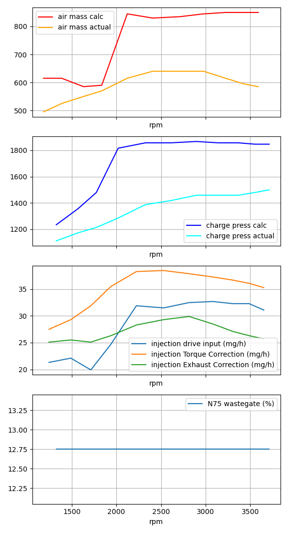 Er lijkt me hier toch iets goed mis, want er wordt helemaal nergens enige turbodruk opgebouwd. Dan komt er dus ook te weinig lucht binnen, waardoor de lmm denk ik ook lagere waardes blijft aangeven: er komt simpelweg niet meer langs.