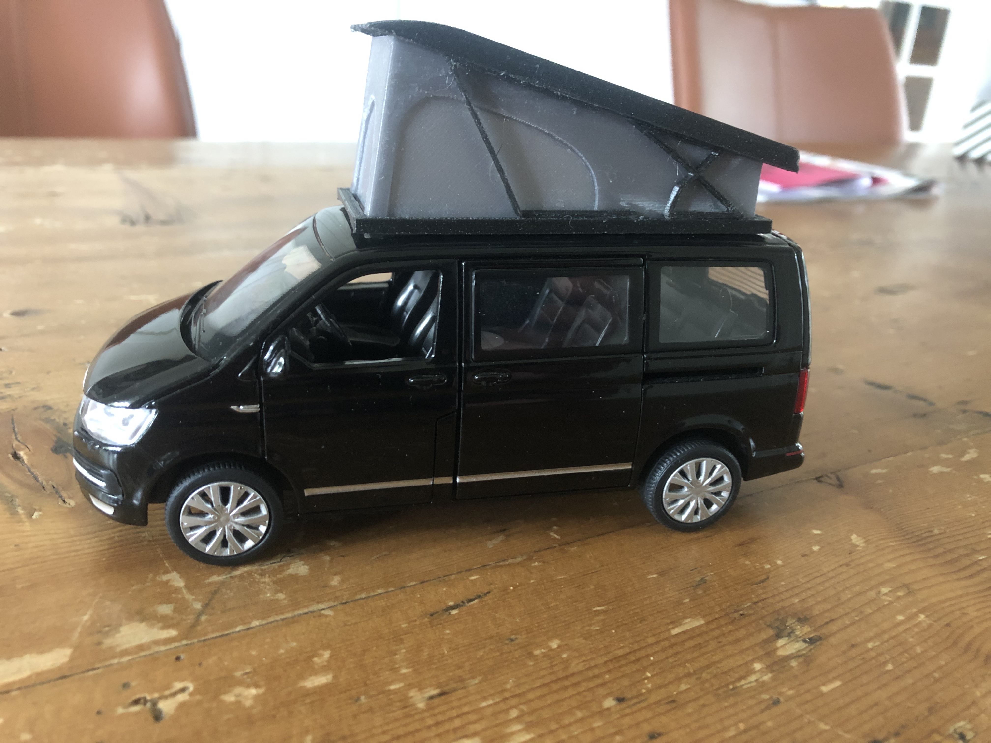 Op een al een tijdje geleden gekocht Multivan modelletje heb ik (in een vlaag van verstandsverbijstering/zonnesteek - of eigenlijk als een Fusion360 oefenprojectje ) een hefdak nabootsing gemaakt met mijn 3D printertje. De maatvoering klopt niet, het is wat erg hoog uitgevallen denk ik, mijn excuus is dat ik uit mijn hoofd heb zitten tekenen. Slaat nergens op, maar wilde het toch even delen…..