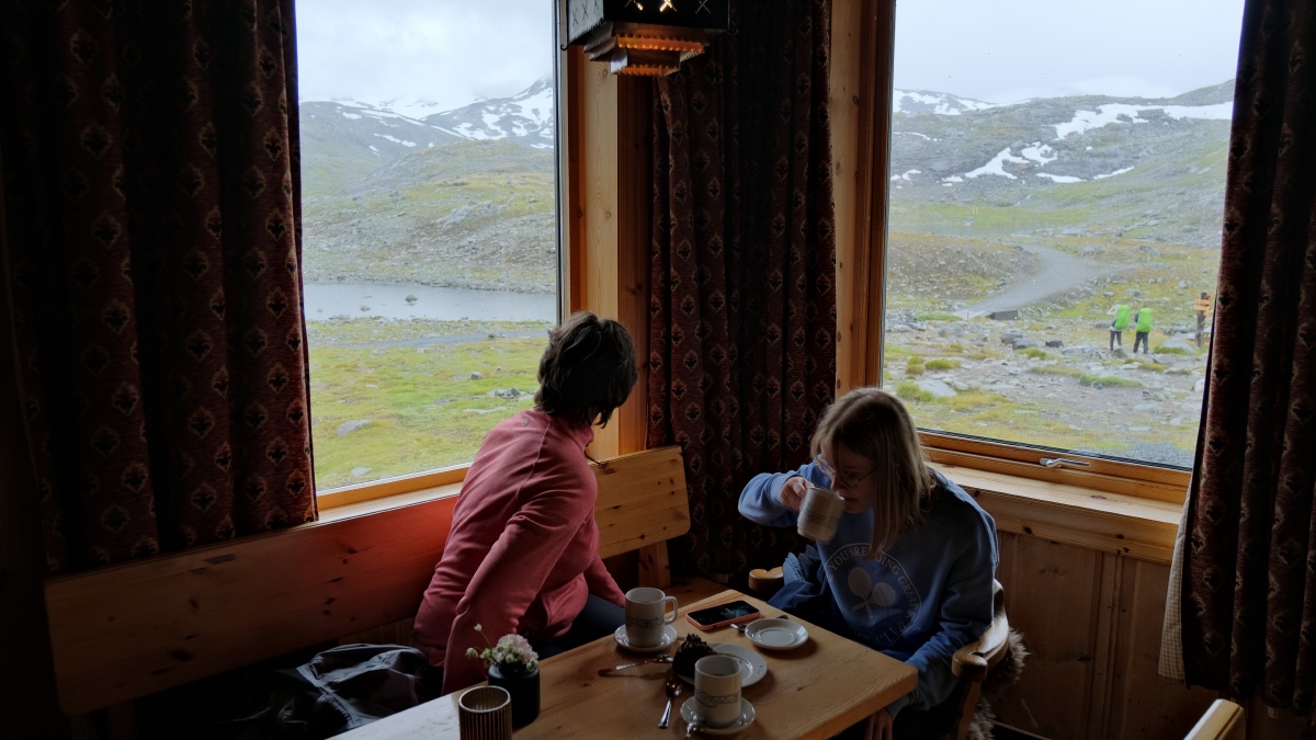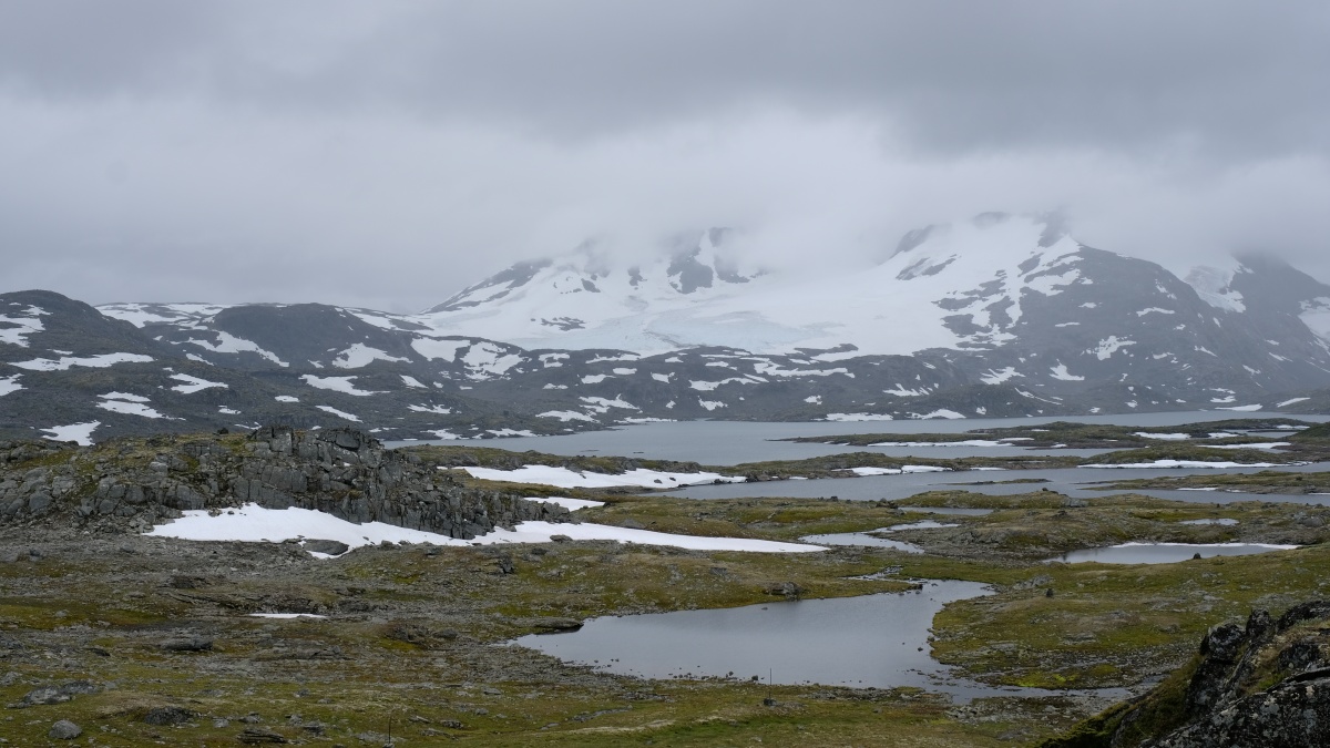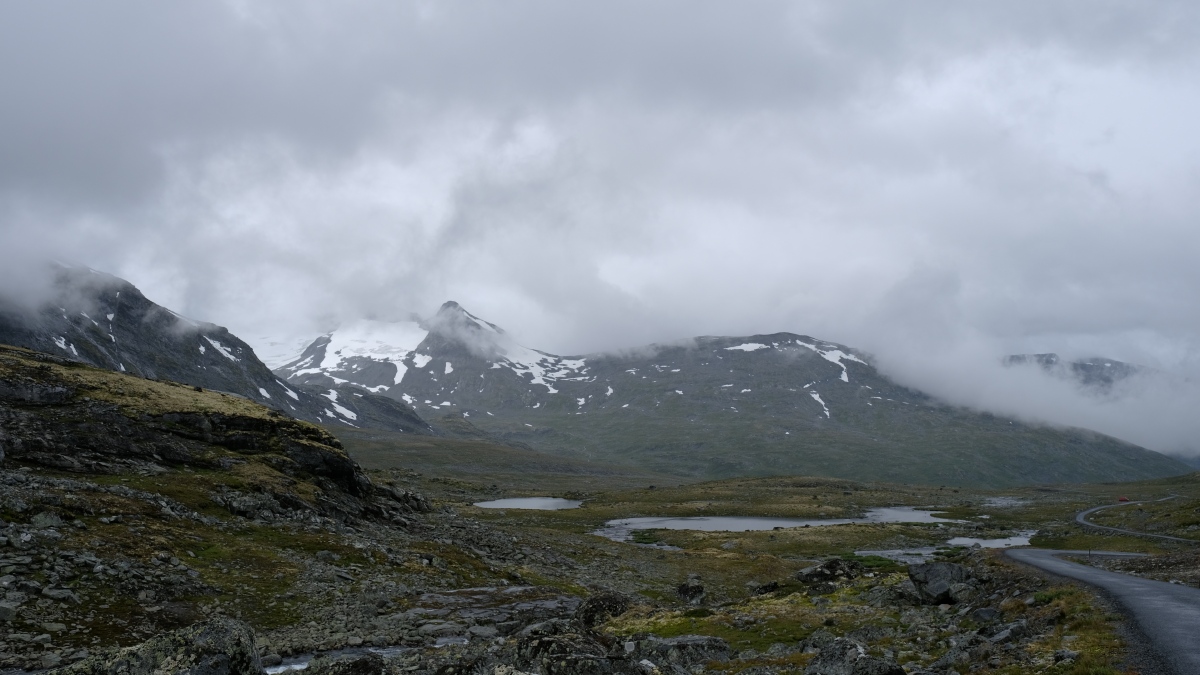 Gisterenavond was er regen, 's nacht ook en toen de wekker vanmorgen ging nog steeds. We hebben ons niet gehaast om te vertrekken zal ik maar zeggen. Toen alles dan uiteindelijk toch opgegeten, opgeruimd en opgevuld geraakt was, gingen we een kijkje nemen aan het Sommerskisenter (Juvashytta) aan het eind van de Raubergstulsvegen. Ja, ginds boven was het hoog en koud genoeg om regen te transformeren tot sneeuw! De skipiste was open en een enkeling gleed langzaam door de mist naar beneden. Een moedige jonge papa vertrok met de stoeltjeslift net naar boven met zijn kleine kleuter. Dat kind kon duidelijk al goed skiën! Hoezo koud, en regen, en stugge wind en vies weer???