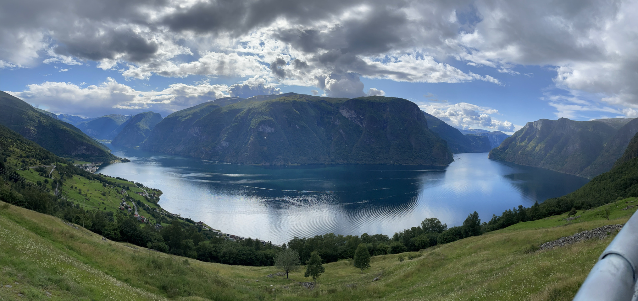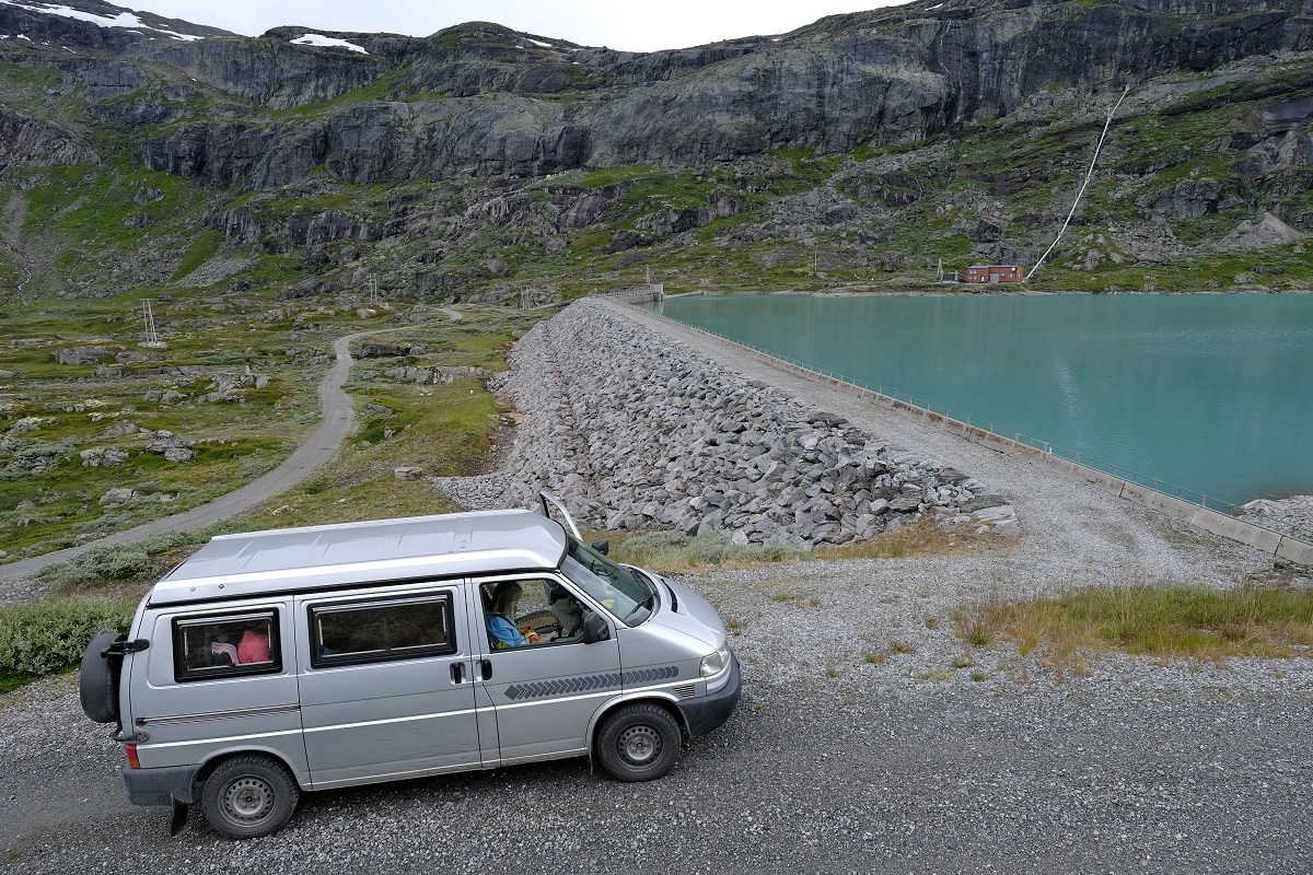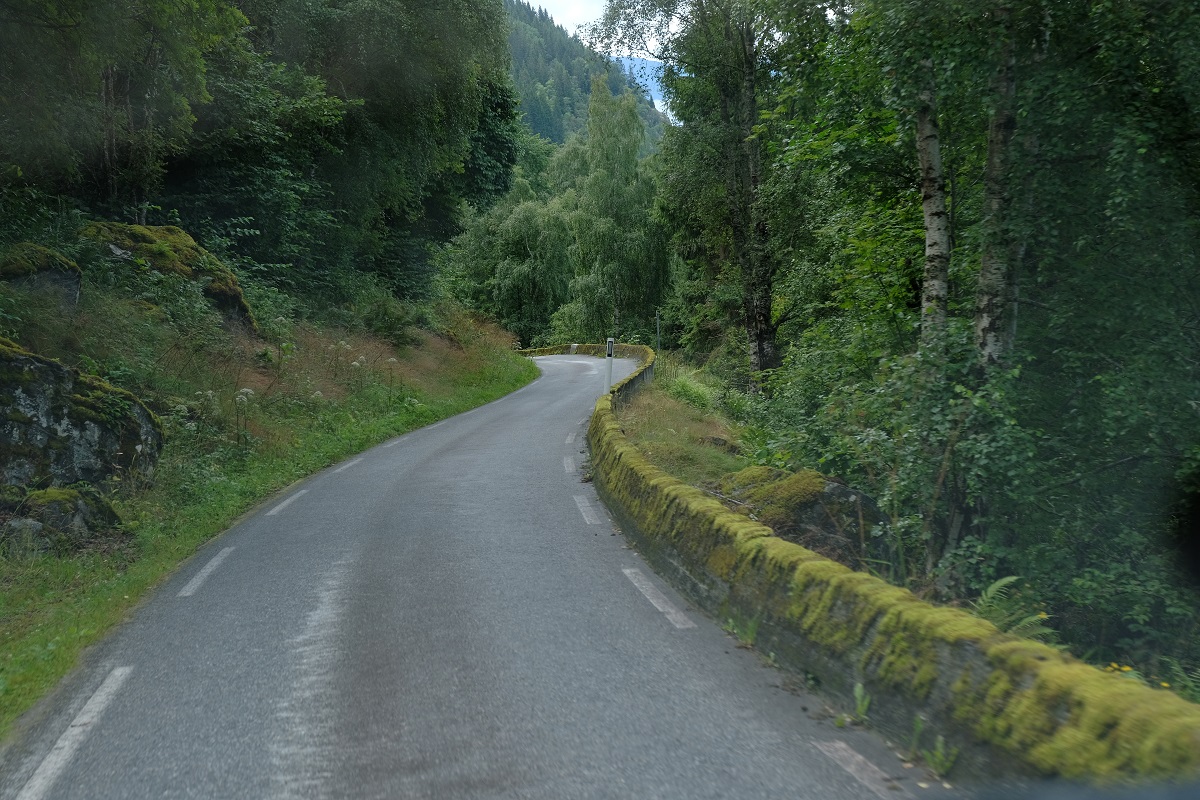 Een heel pak tunnels gedaan, de ene kort de andere lang (11km). De langste, de Laersdaltunnel van 24,5km, hebben we omzeild door over de berg te rijden. Héél erg mooi. Dikke aanrader. Het is een prachtige klim omhoog doorheen het Hørnadalen, met de mooie Sluppen watervallen onderweg, waar je met wat brugjes enkele keren over de vallen kan. Verderop een ZEER mooi kaal bergplateau, Aurlandsfjellet genaamd. Veel stopplaatsen, veel fotomogelijkheden. De afdaling door het Kvammadalen naar het pittoreske Aurlandsvangen is echter geen lachertje. Het is sowieso nauw, maar an sich is dat geen probleem. Er zijn gewoon erg veel tegenliggers, dus je zit letterlijk van wegverbreding naar wegverbreding te kruipen. Plus was er nog eens een takelwagen aan het werk. De kers op de taart kwam echter op het laatst toen we nét het dorp inreden: er stond een bus klaar om naar boven te rijden!! Ik wil me de ellende die dat gaat geven niet voorstellen.... Door al dat gedoe hebben we helaas niet kunnen stoppen aan het viewpoint boven aan de enorm impressionante Aurlandsfjorden. ...