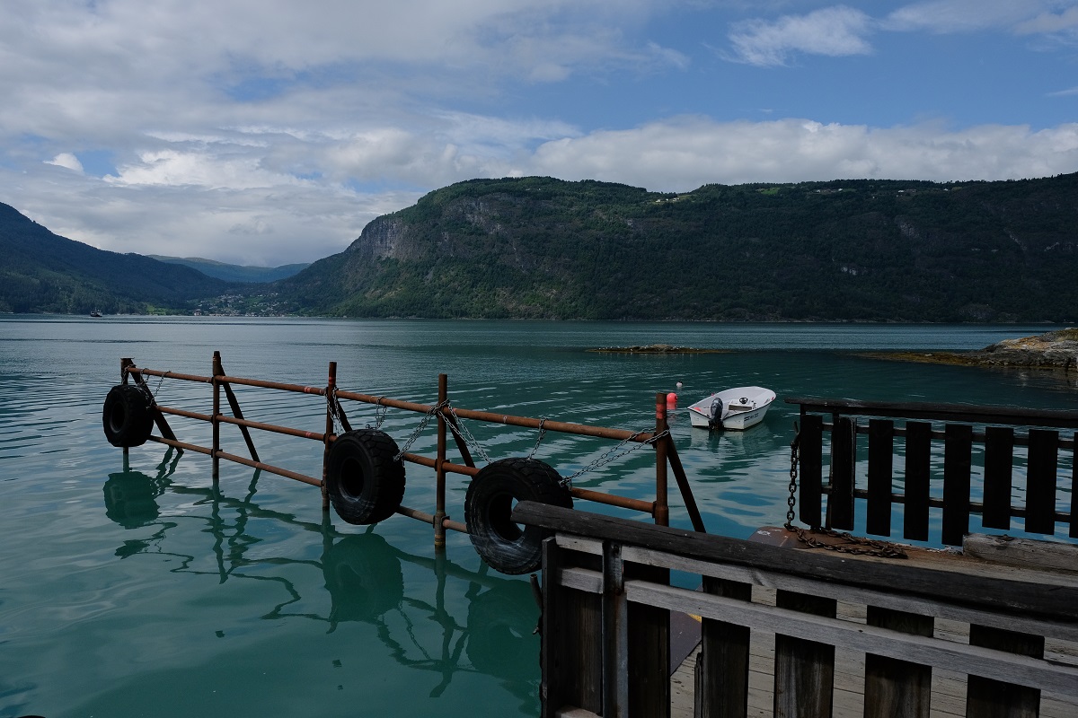 We zijn vanaf Skjolden binnendoor naar Urnes gereden waar de oudste staafkerk van Noorwegen staat. 900 jaar, je kan het je niet voorstellen. Onze gids was een Fransoos, vreemd vonden we dat. En eigenijk wist hij er ook niet echt veel van. Teleurstellend. Maar het kerkje dat in de loop der eeuwen enkele keren her- en verbouwd is, is wel de moeite! De weg er naartoe, langs onder het Lustrafjord, en dus niet over de ook mooie 55, was heel erg fijn. Want érg rustig. Het is dan ook een wegje dat enkel door lokale mensen wordt gebruikt. 99% van de toeristen rijdt gewoon de 55 af en neemt dan het veertje en wandelt dan gewoon nog 500m tot het kerkje. Maar het erg smalle wegje is zeker de moeite. Er zijn veel heel rustige stopplaatsen vlakbij het rimpelloze fjordwater. Plus er zijn drie onverlichte, ruw uitgehakte tunnels. Eentje zelfs 900m als ik me niet vergis. Verdomd dat is lang en zwart! Als fietser is dit ongetwijfeld nog een groter avontuur!