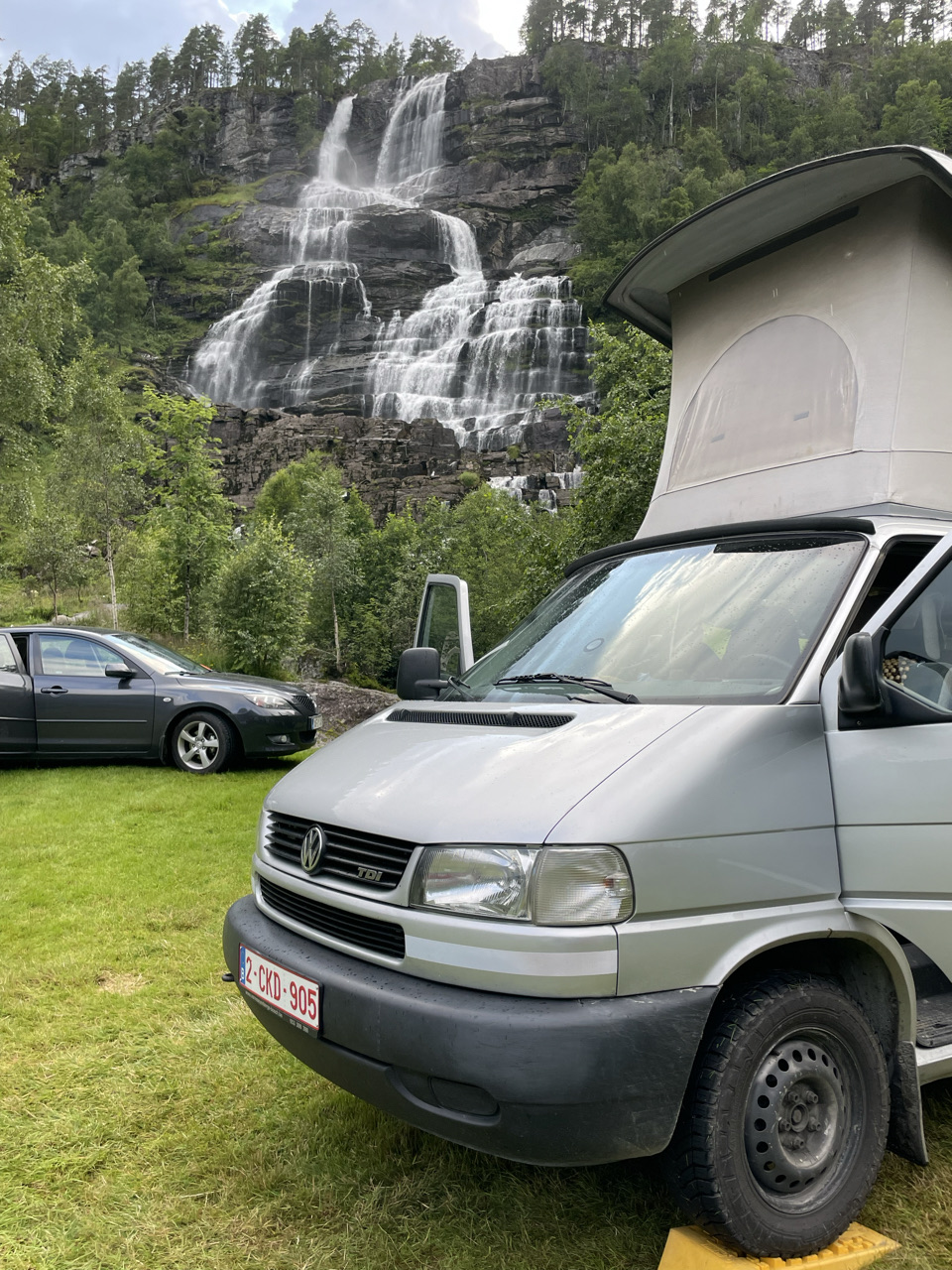 Wildkamperen kan je overal, zeggen ze, maar hoe toeristischer de regio hoe meer verbodsbordjes! En echt, met een handvol wagens op een klein plaatsje staan vind ik nog erger dan op een drukke camping staan. Dus pas om 19u een slaapplek gevonden op de Tvinde camping. Beetje vreemd dat die uitbater zulk een enorme souvenirswinkel had, maar tien minuten later snappen we het al. Hier stoppen om de haverklap bussen bomvol toeristen die naar de waterval stappen, selfies nemen, kampeerders fotograferen, een souvenir kopen en weer opstappen en weggevoerd worden. De eerste bus bevat een lading Indiërs, zo lijkt het. De tweede een lading mensen-met-hoofddoeken.