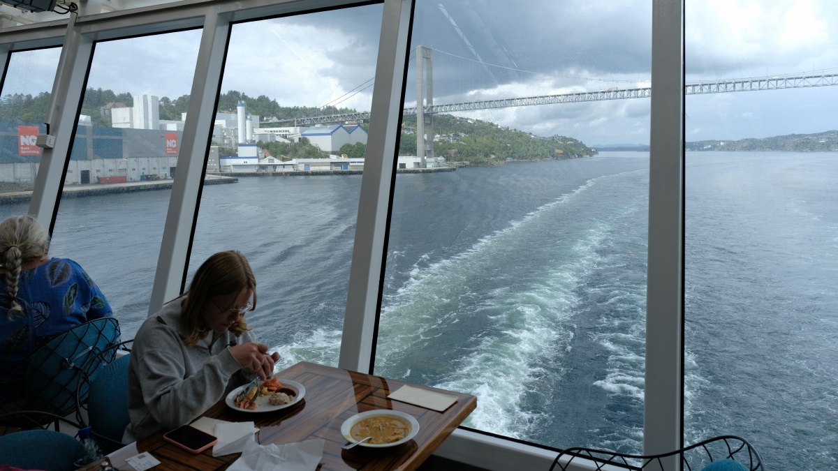 Zondag hebben we dan de boot van Bergen naar Hirtshals genomen, en ik kan zeggen dat dat een geweldige aanrader is, omdat je je niet naar Kristiansand moet haasten. Doe jezelf trouwens een plezier en neem de lunch op de boot. Kostte 78 voor drie, en het is all-you-can-eat zeg maar. Je hebt 2,5u tijd om te aperitieven en talloze gangen te eten. Gevolgd door diverse desserts, kazen en bieren. Allemaal inbegrepen. Je zit zo vol dat je zelfs 's avonds nog geen honger hebt, lol. Plus de rust! We waren maar met tien mensen, drie tafels in het restaurant! Zalig