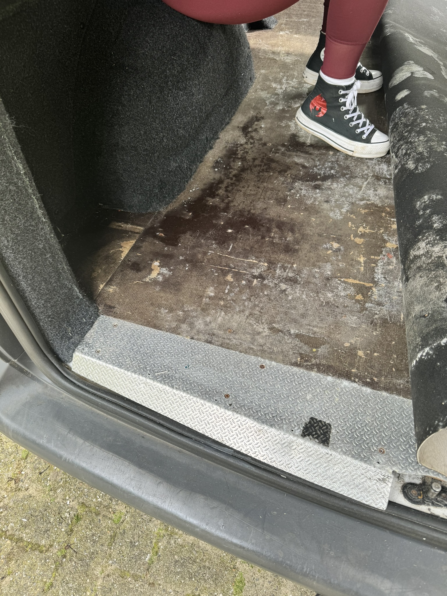 Muurpaneel wat ik los heb gemaakt, dat is niet geïsoleerd en gewoon leeg erachter. Je kijkt gewoon tegen het kale metaal van de bus aan. Daar moet nog een raam komen, maar weten nog niet of dat gaat lukken voor onze eerste trip(15 juni).