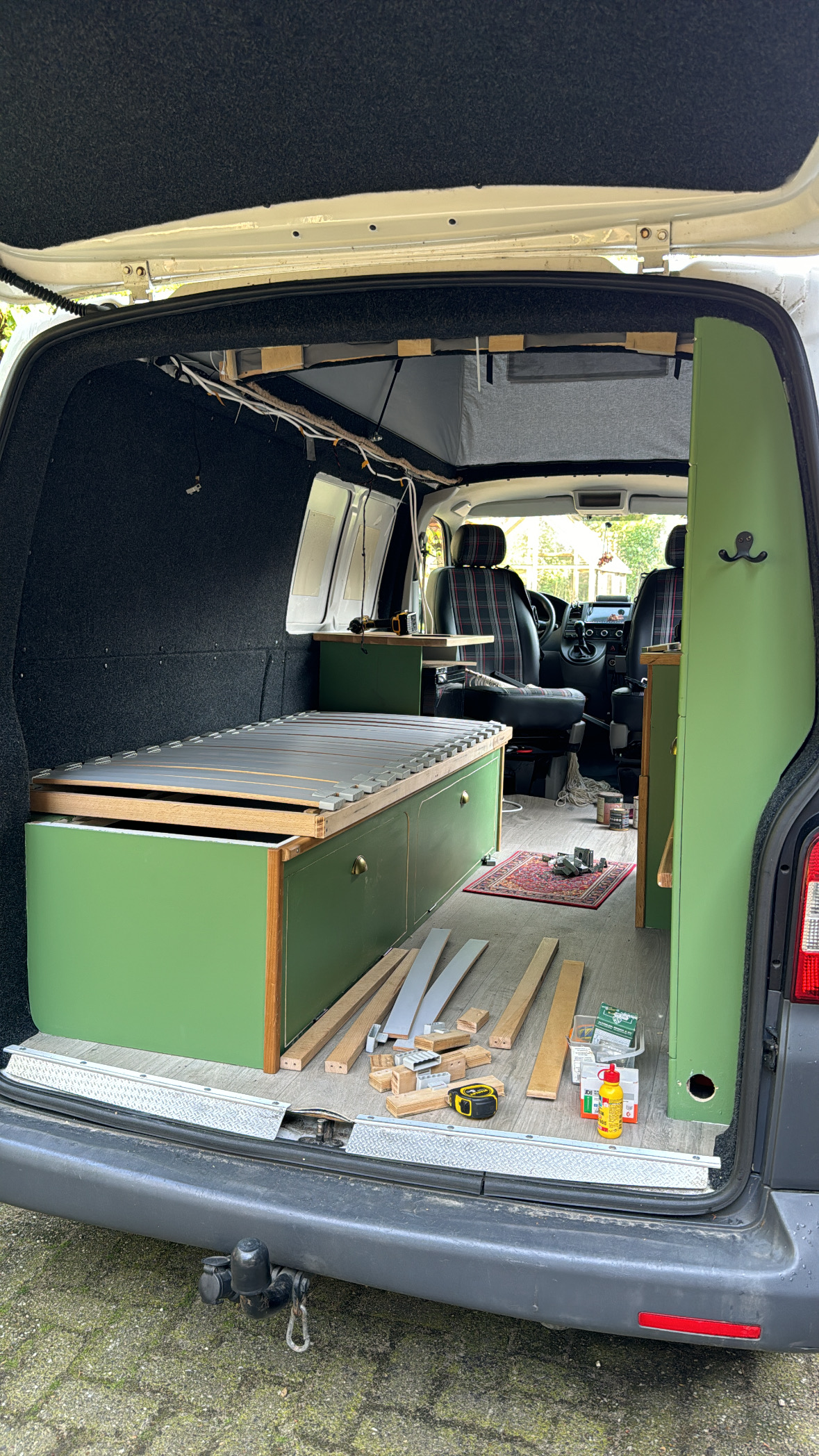 Lattenbodems gekocht, helemaal uit elkaar gehaald en op maat in de bus geplaatst. Bus is niet recht (of de kastjes niet) en dus alles moet met een paar CM verschil ingebouwd worden. Resultaat is al vrij mooi, daarnaast koelkast geplaatst en nu alleen nog een la onder het blad maken.