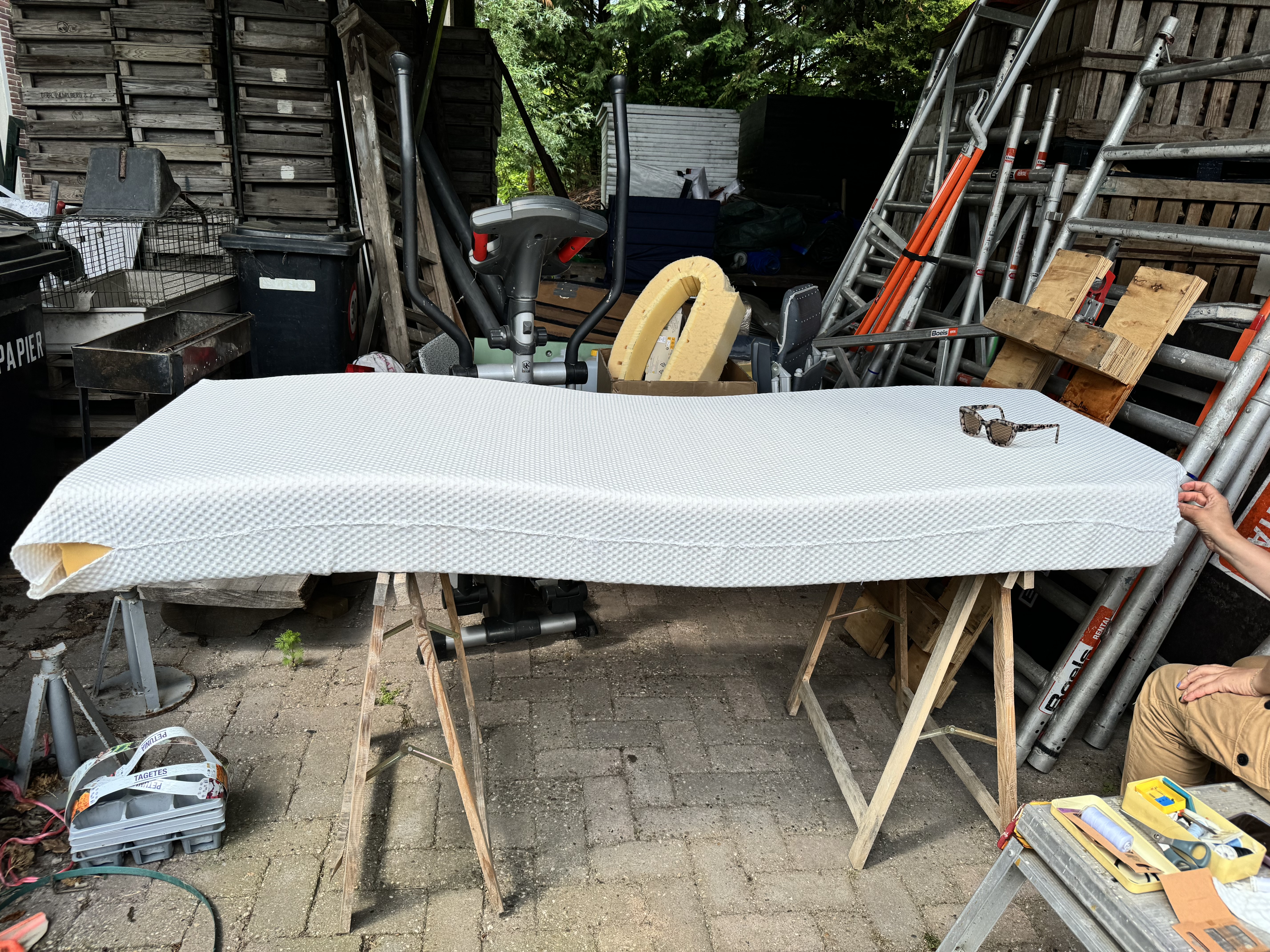 Daarnaast een Ikea Abygda matras gekocht via MP. Deze hebben we in 2 delen gemaakt (1deel voor de latte bodem van 70 breed) en 1 deel als rugleuning en slaap gedeelte.