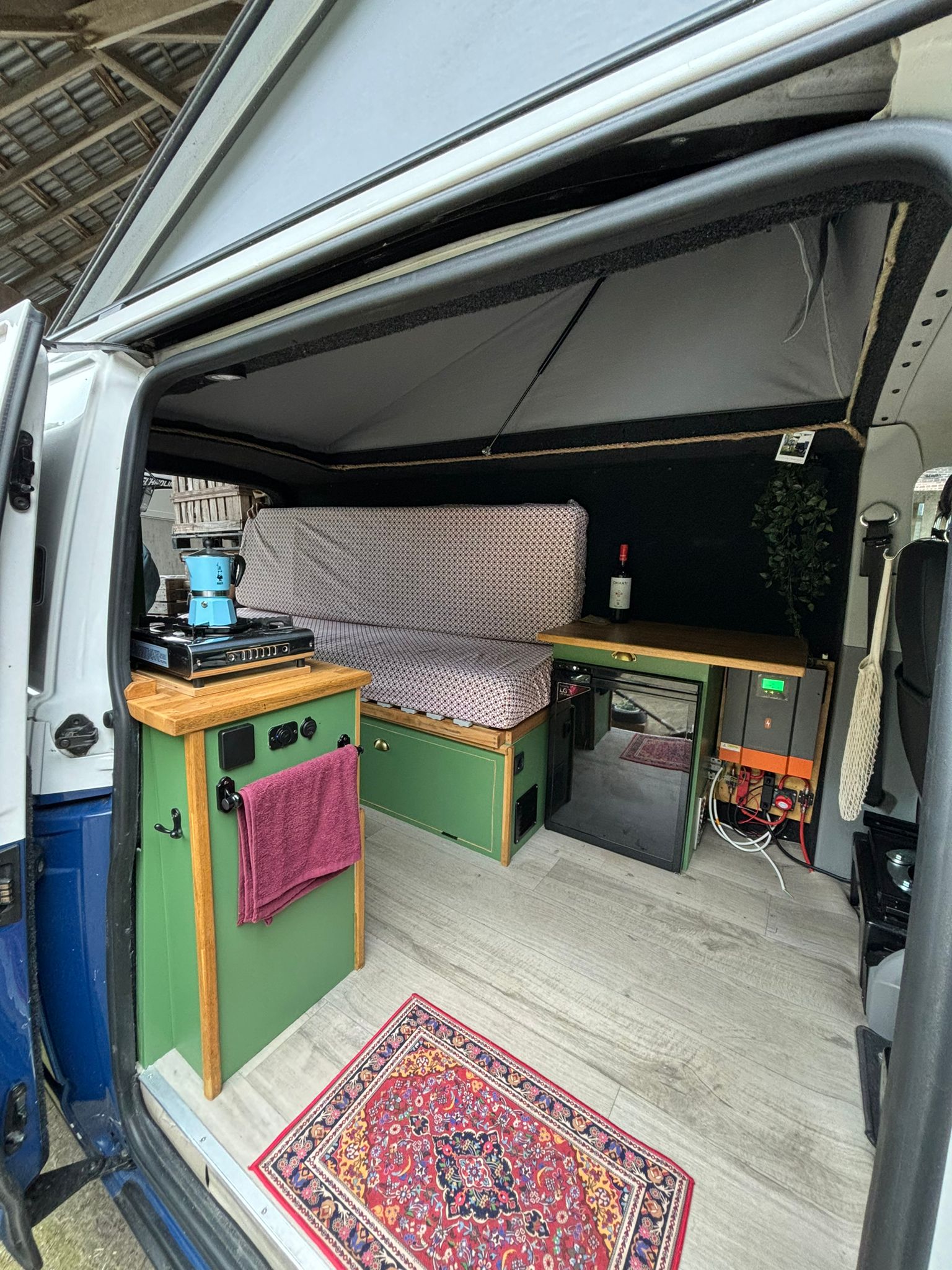 De matrassen zijn gemaakt, de kastjes hebben nu extra deurtjes en de lattenbodem kan uitgeschoven worden. We hebben een led strip aangebracht met Led dimmer, dit voor de normale verlichting in de bus op 12V. Daarnaast nog extra USB-c 4.0 en 1x USB-A 3.0 geplaatst. 1 Stopcontact extra voor op de omvormer(2 totaal op omvormer) en 1 stop contact voor wal stroom gebruik welke niet via de omvormer loopt.