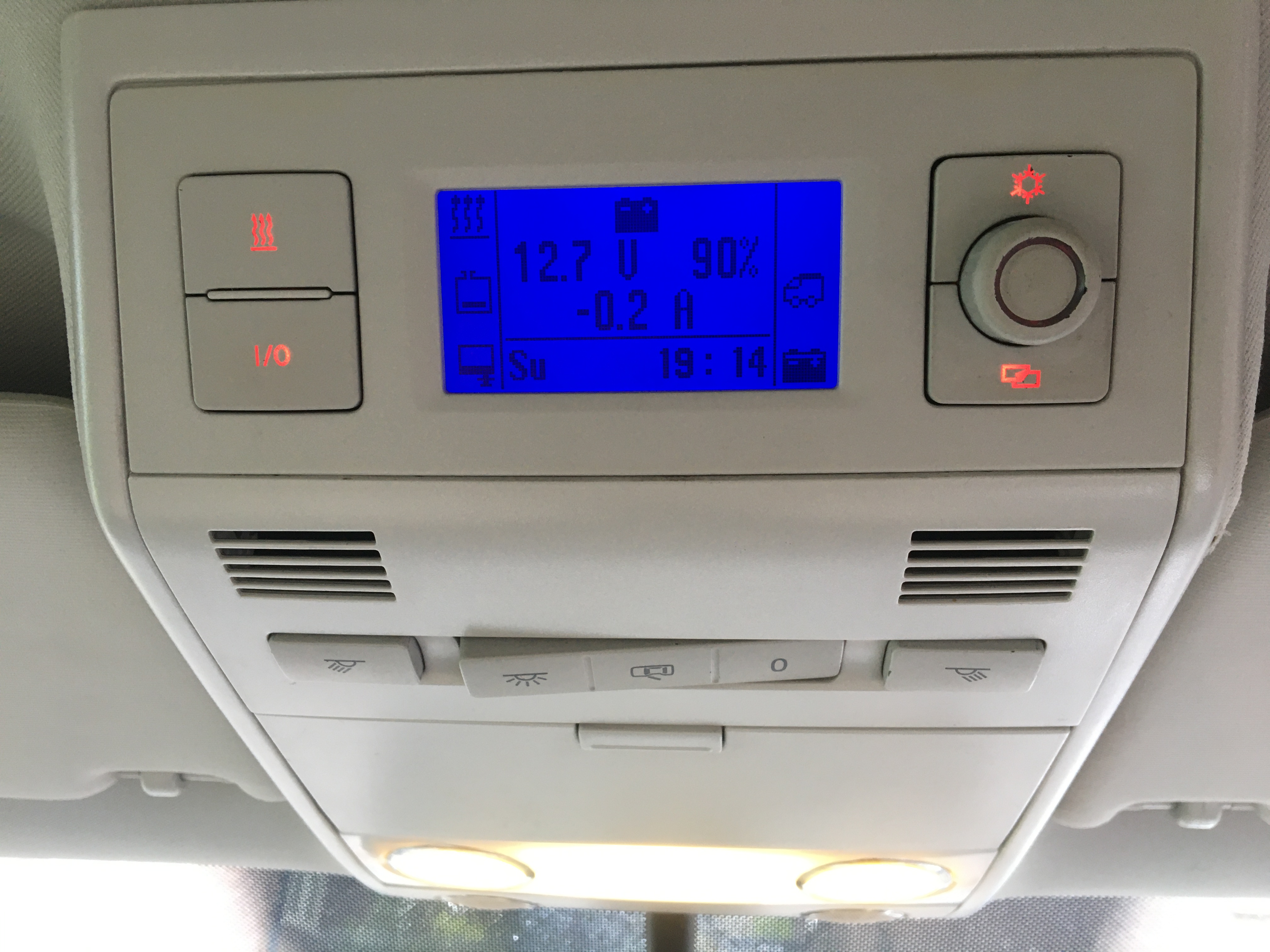 Ik neem aan dat kastje rechts halverwege de bus in het dak met links en rechts ventilatie-openingen met knoppen voor ventilator en blowerstand? Die zit er gewoon in maar de display is uit. Ik heb getracht om hem los te halen om te kijken of hij wel zit aangesloten maar ik krijg hem niet los.