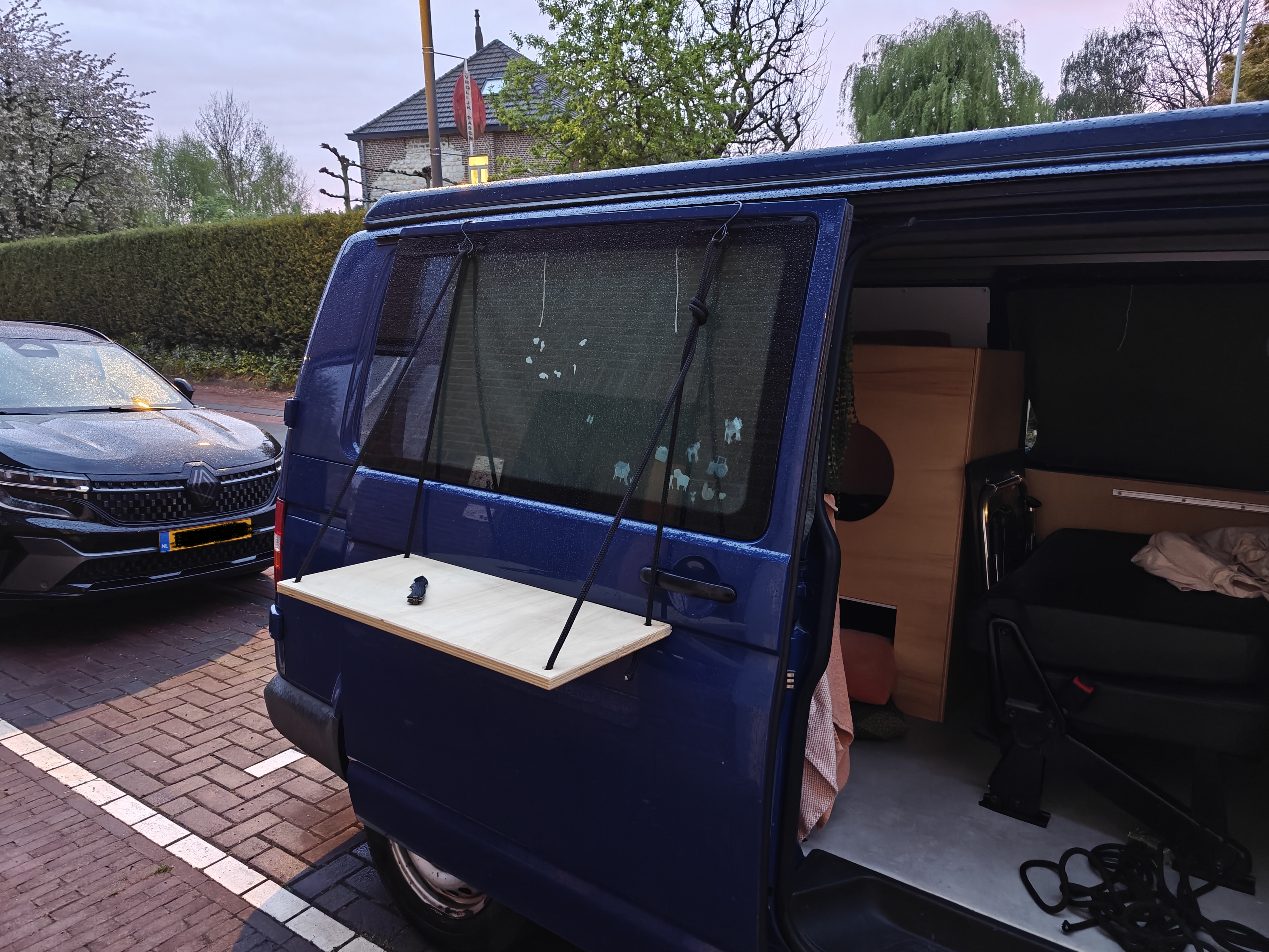 Buitentafel die aan schuifdeur op te hangen is, erg fijne extra ruimte om buiten spullen te zetten.