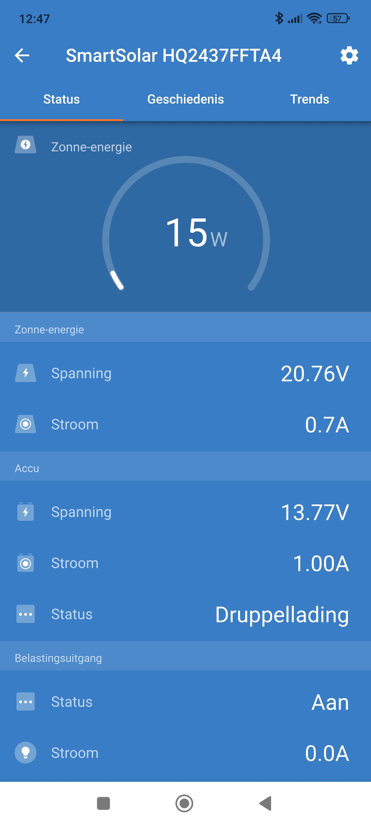 De regelaar is gekoppeld via bluetooth en ik kan dan zo zien wat het zonnepaneel doet op de app. Nu heeft ze niet veel, is aan het druppel laden.
