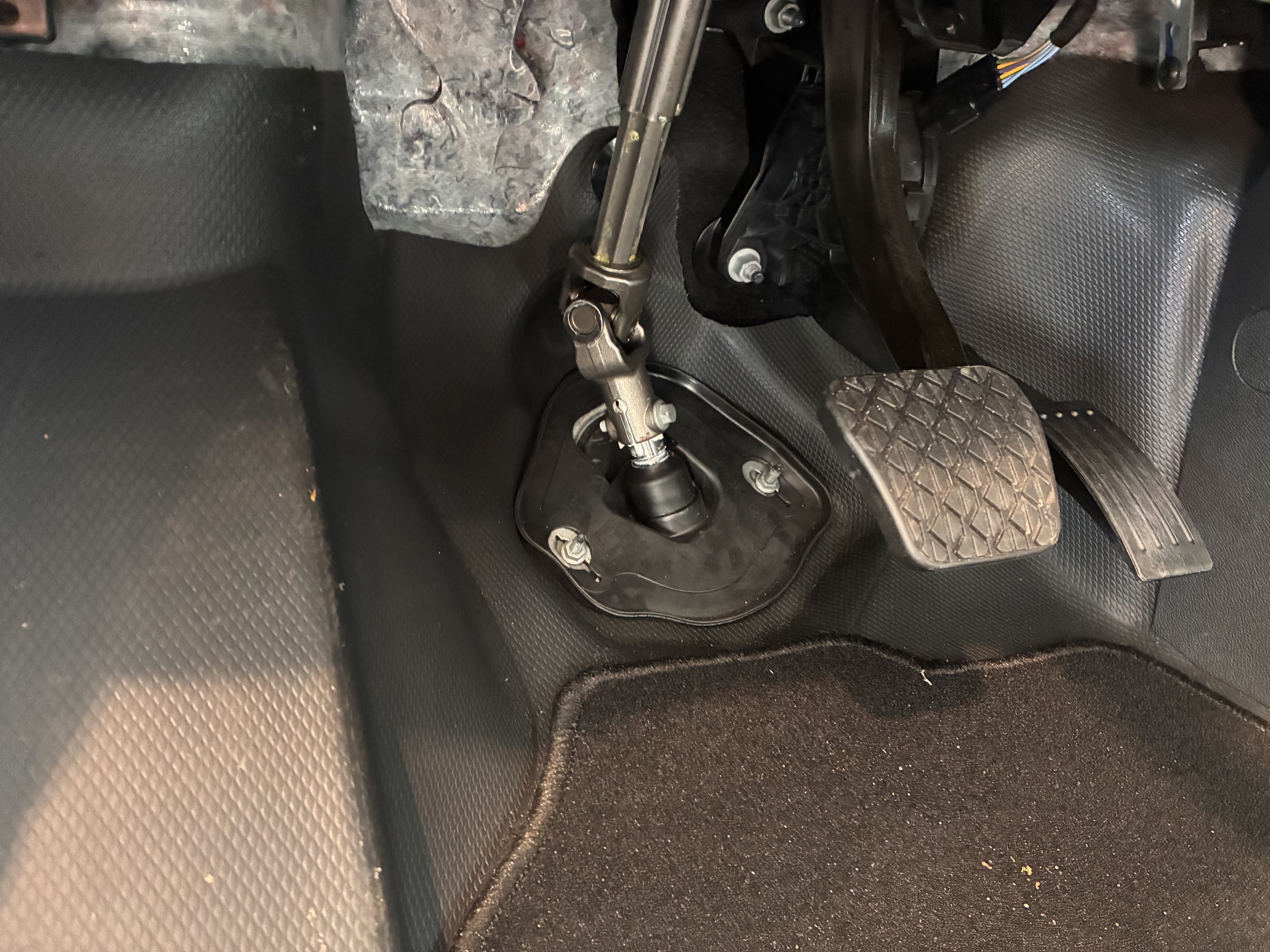 ik blijf dit wel een vreemd ding vinden in de T7, dat er niet een schutbordje voor de stuurstangkoppeling staat, of zo, maar dat 'ie zo open en bloot in de cabine staat, tussen de pedalen. Als ik denk aan het vuil dat wij soms na een wandeling naar binnen stappen op onze rubbermat...