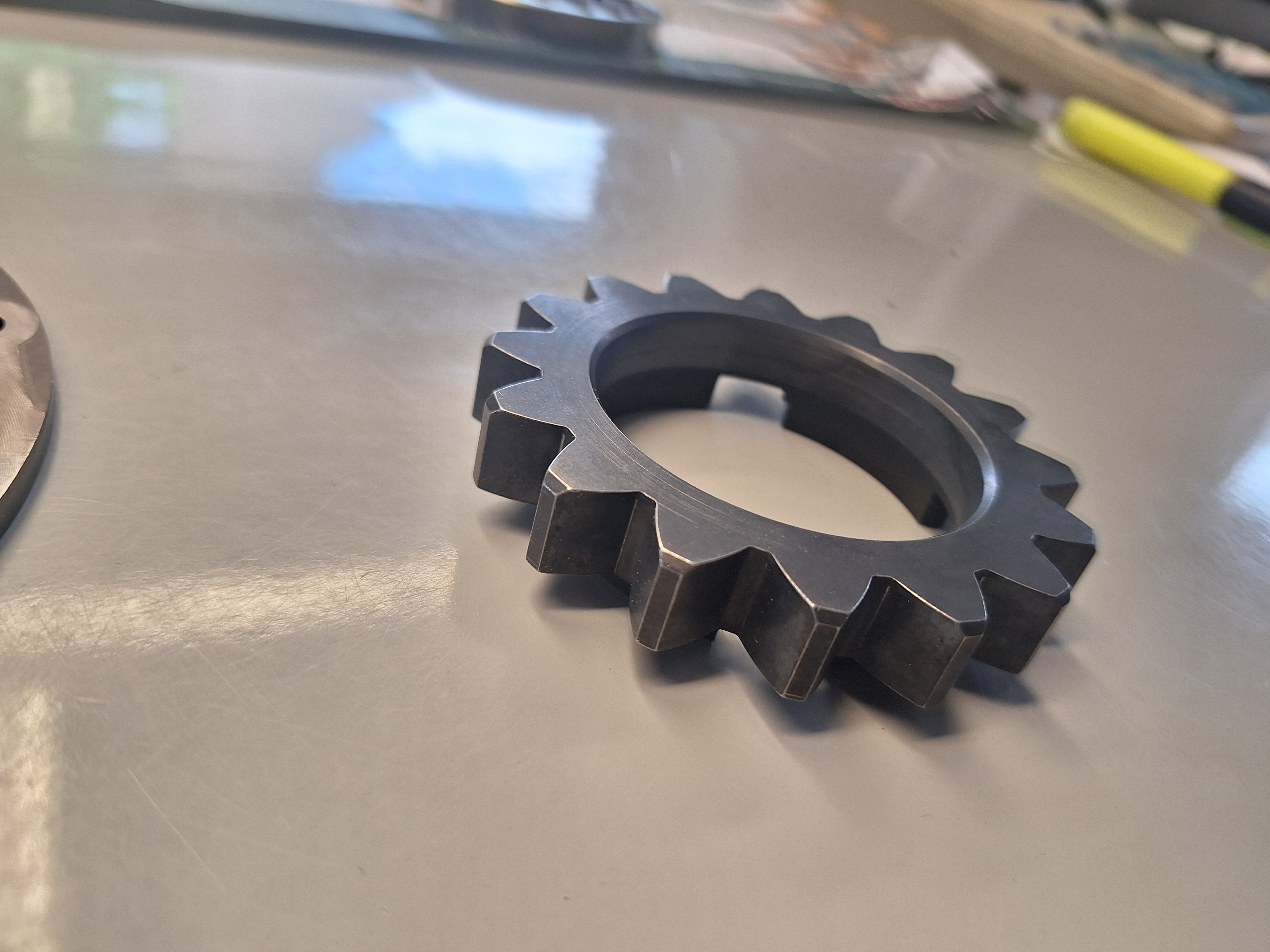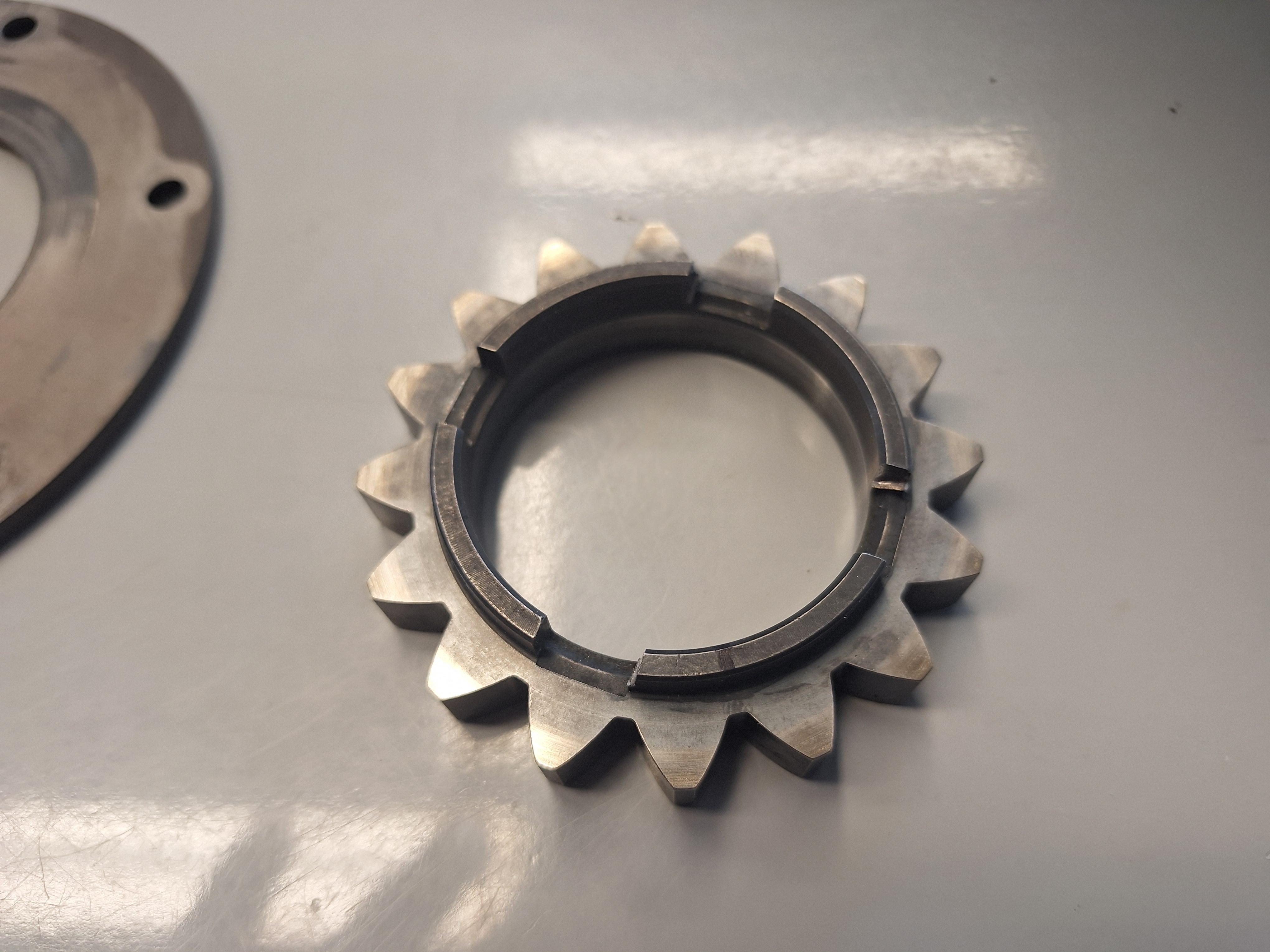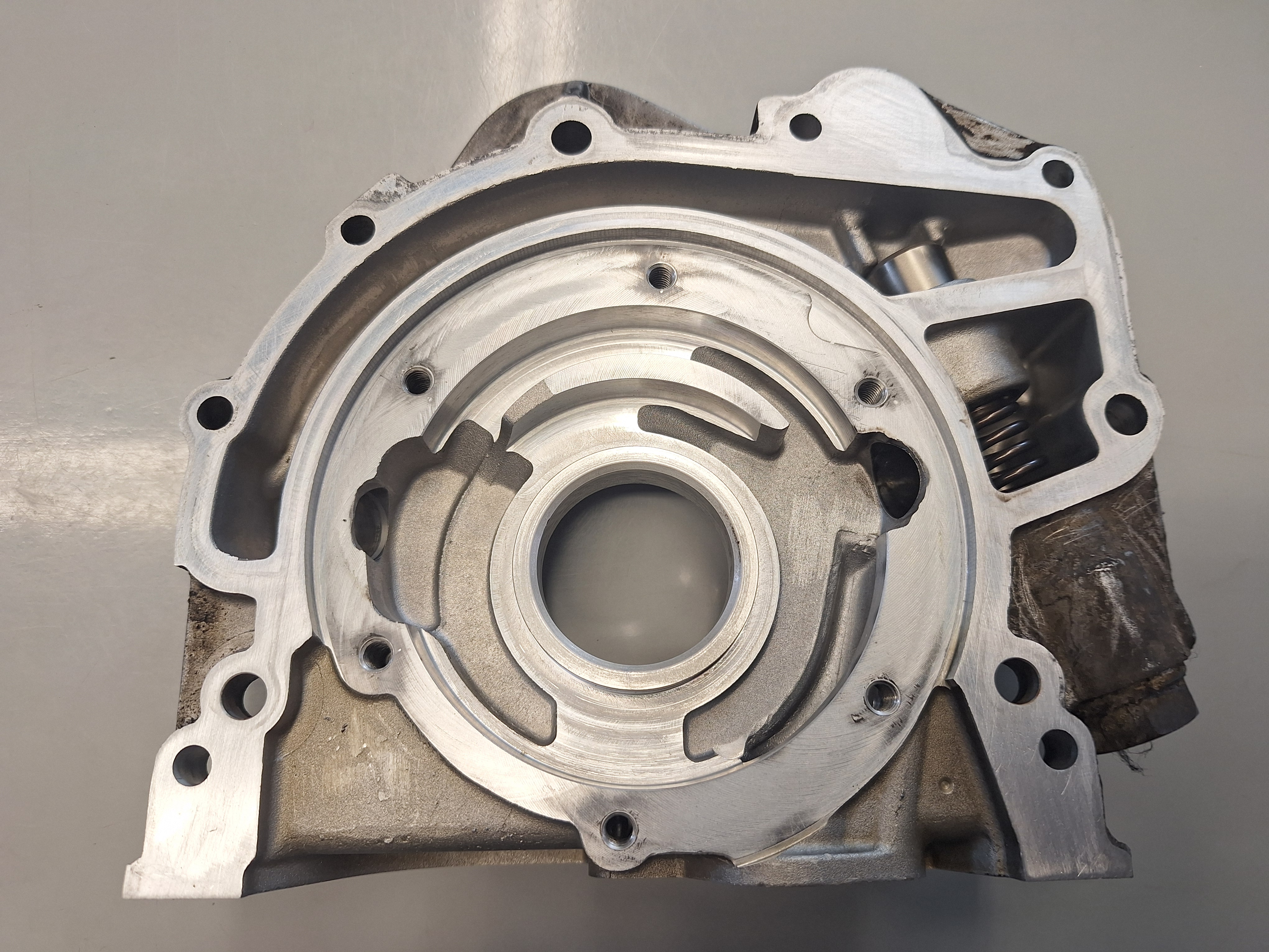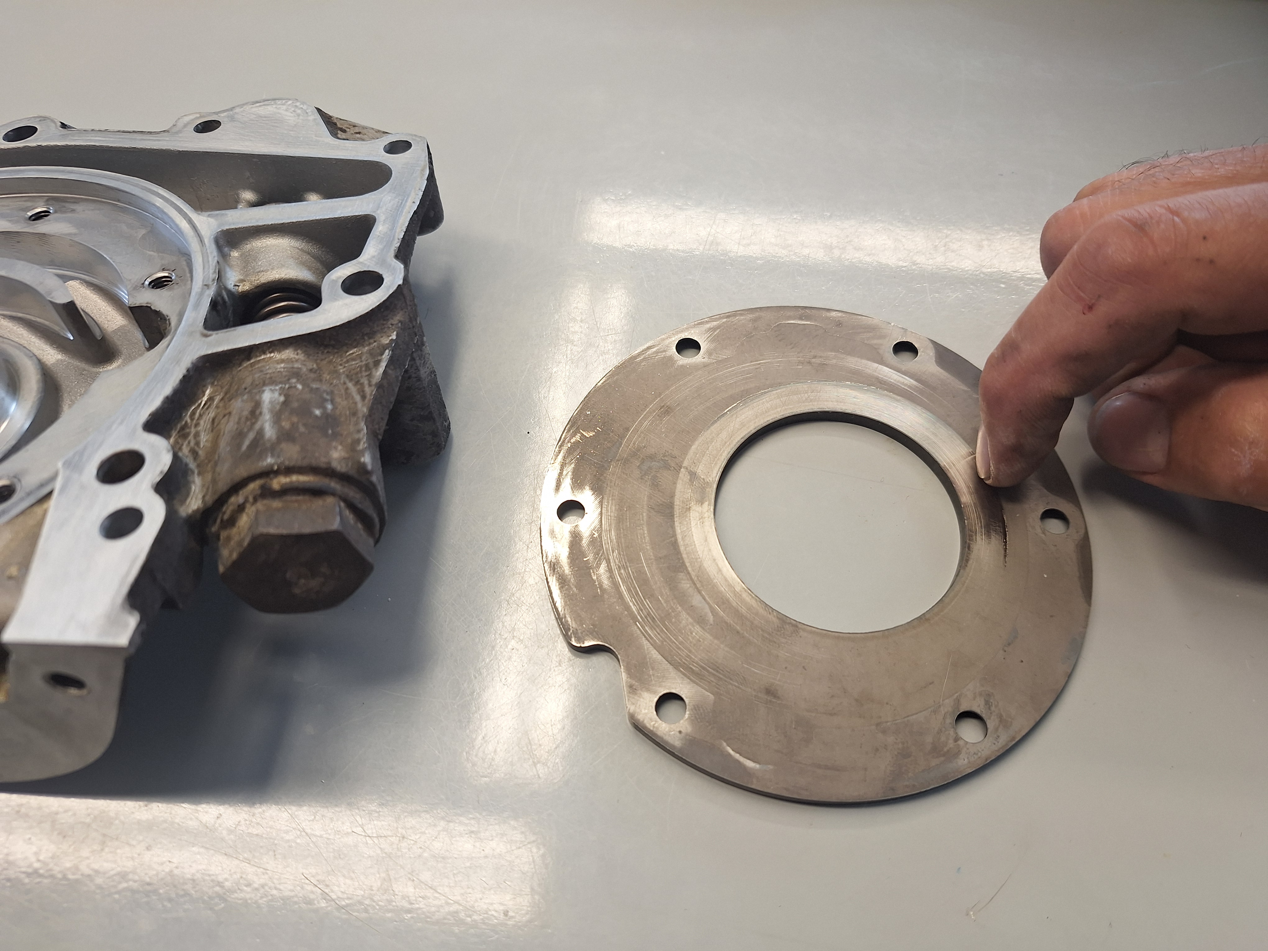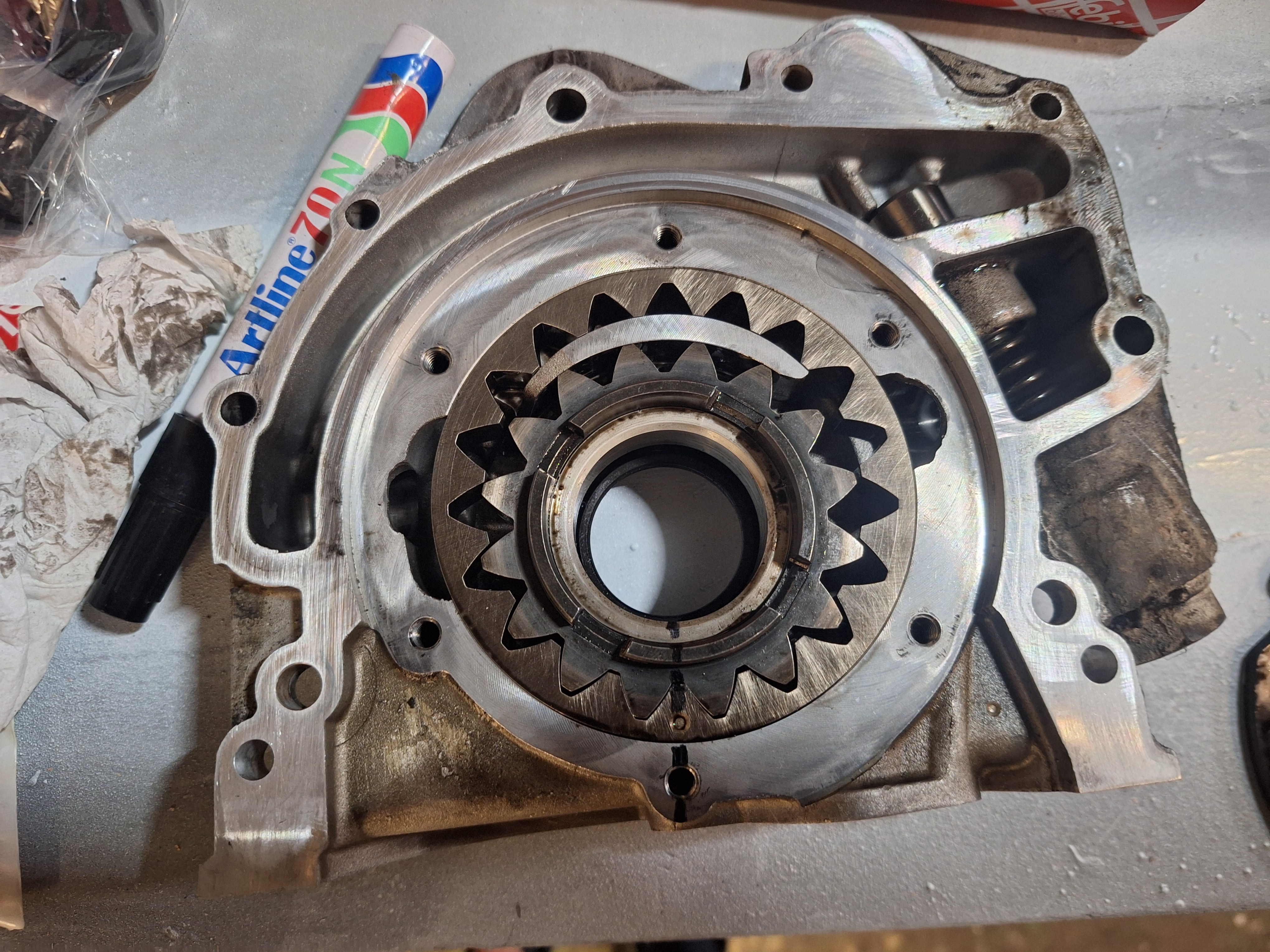 Maar nu, de oliepomp. Ik heb 'm open gemaakt. Ik moet er wel bij zeggen dat het de eerste oliepomp van mijn leven is dat ik open maak, dus ik ken er eigenlijk de ballen van. Maar intuïtief vind ik 'm best netjes. Het enige wat ik kan zien is een spoor op de plaat, waar ik mijn vinger houd, maar ik kan geen reliëf detecteren met mijn nagel. Ik meen dat dit een goed pompje is. Nokjes zijn ook proper. Ik ga de boel primer, terug in elkaar steken, en gamble gamble, monteren.