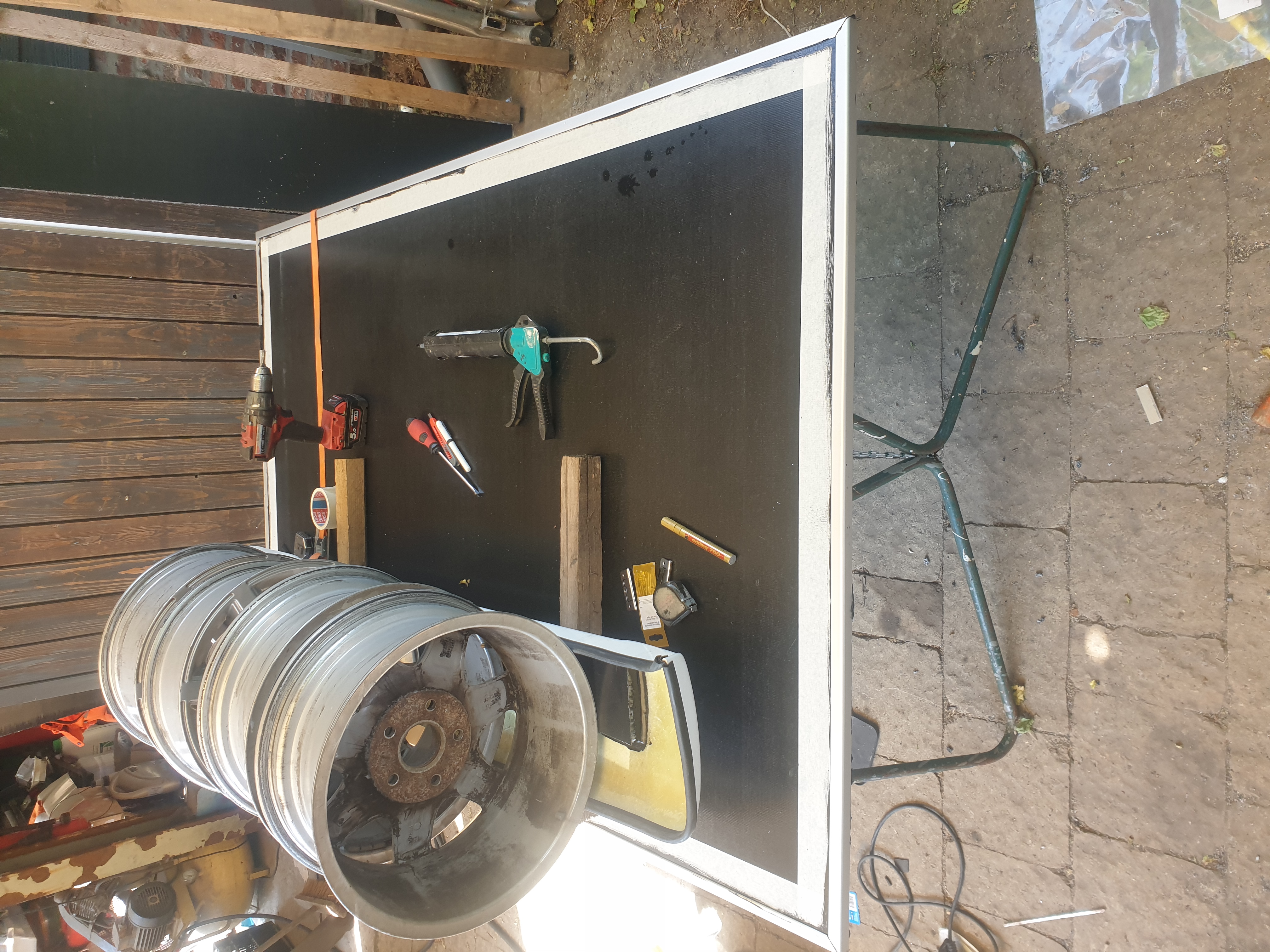 Ik verlijm dan de 150cm lange airlinerails op het hefdak met sika 554 (en eerst primeren) en ter hoogte van de steun nog extra met 2x M6 door en door hefdak met tegenplaatje binnen in hefdak. Ik heb het gewoon blank gekocht en spuit het zelf zwart. Voor 80 euro prijsverschil op gepoedercoate delen kan ik wel een busje matzwart bij de action halen.... is en blijft een ouwe bus :zwaai