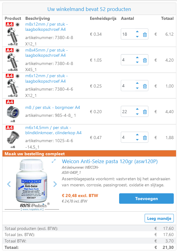 Bij elkaar 22 M8 boutjes, 22 borgmoeren en 4 M6 boutjes en 4 blindklinkmoeren gebruikt. Ik heb redelijk voorraad dat scheelt maar toch kijk ik altijd even na om het sommetje compleet te hebben. (gebruikt en modificeren of gewoon nieuw en geen werk eraan)