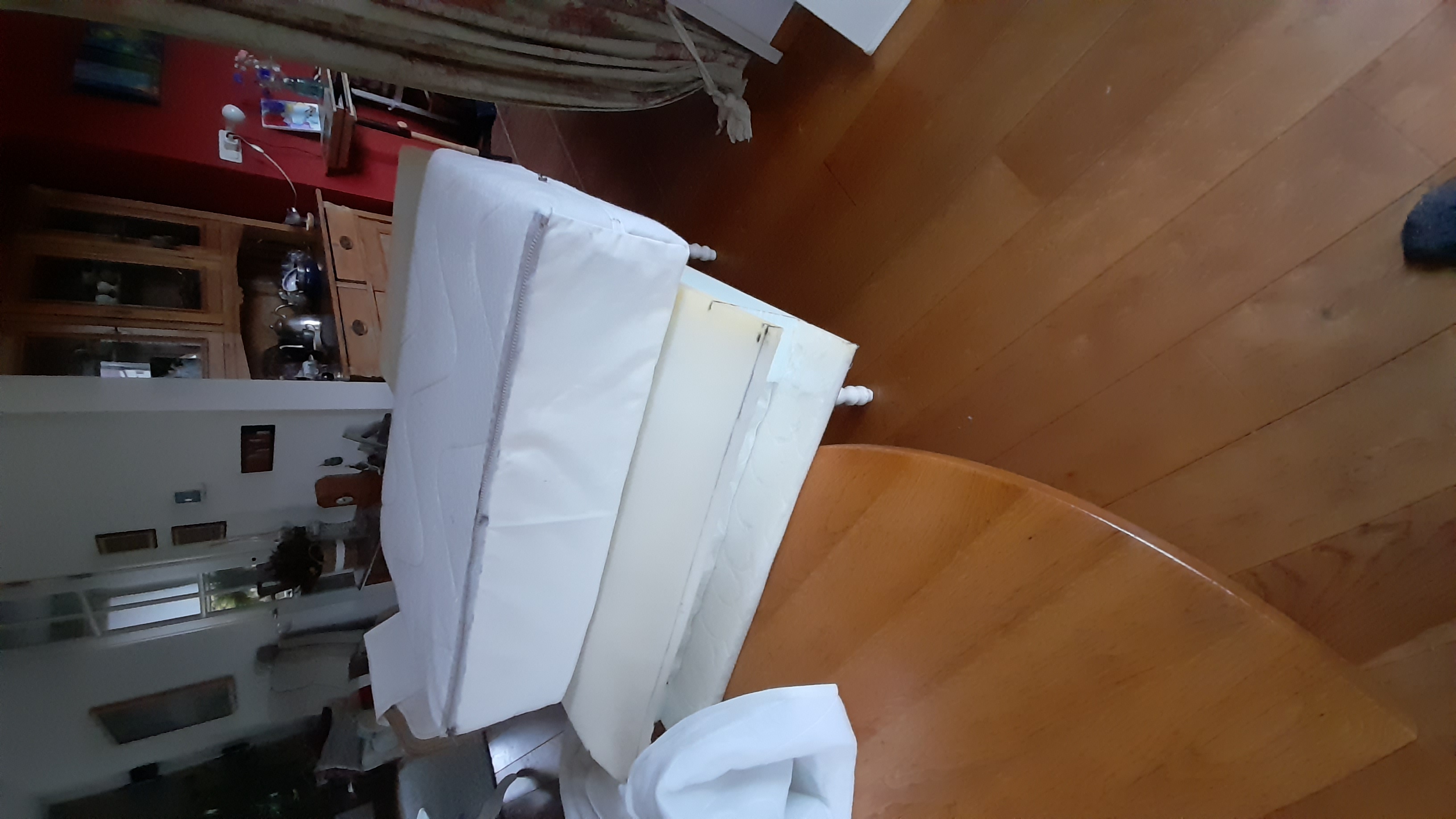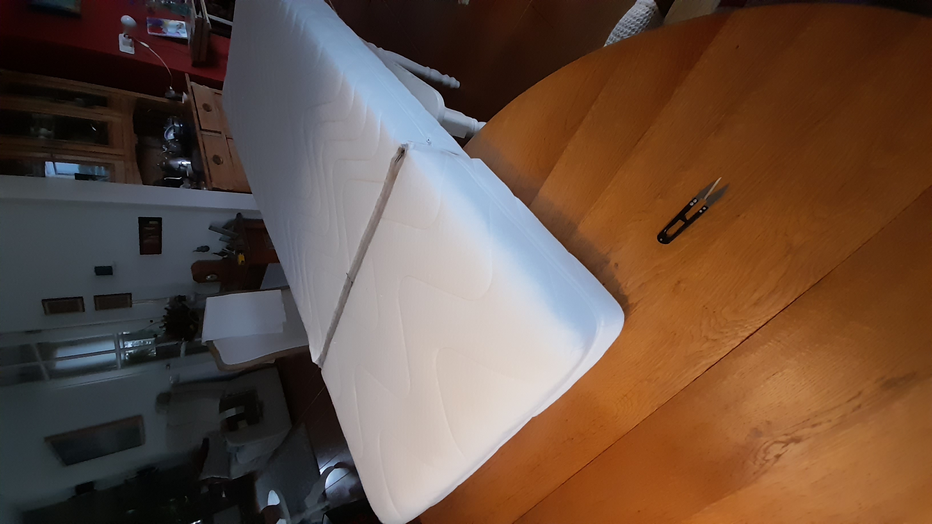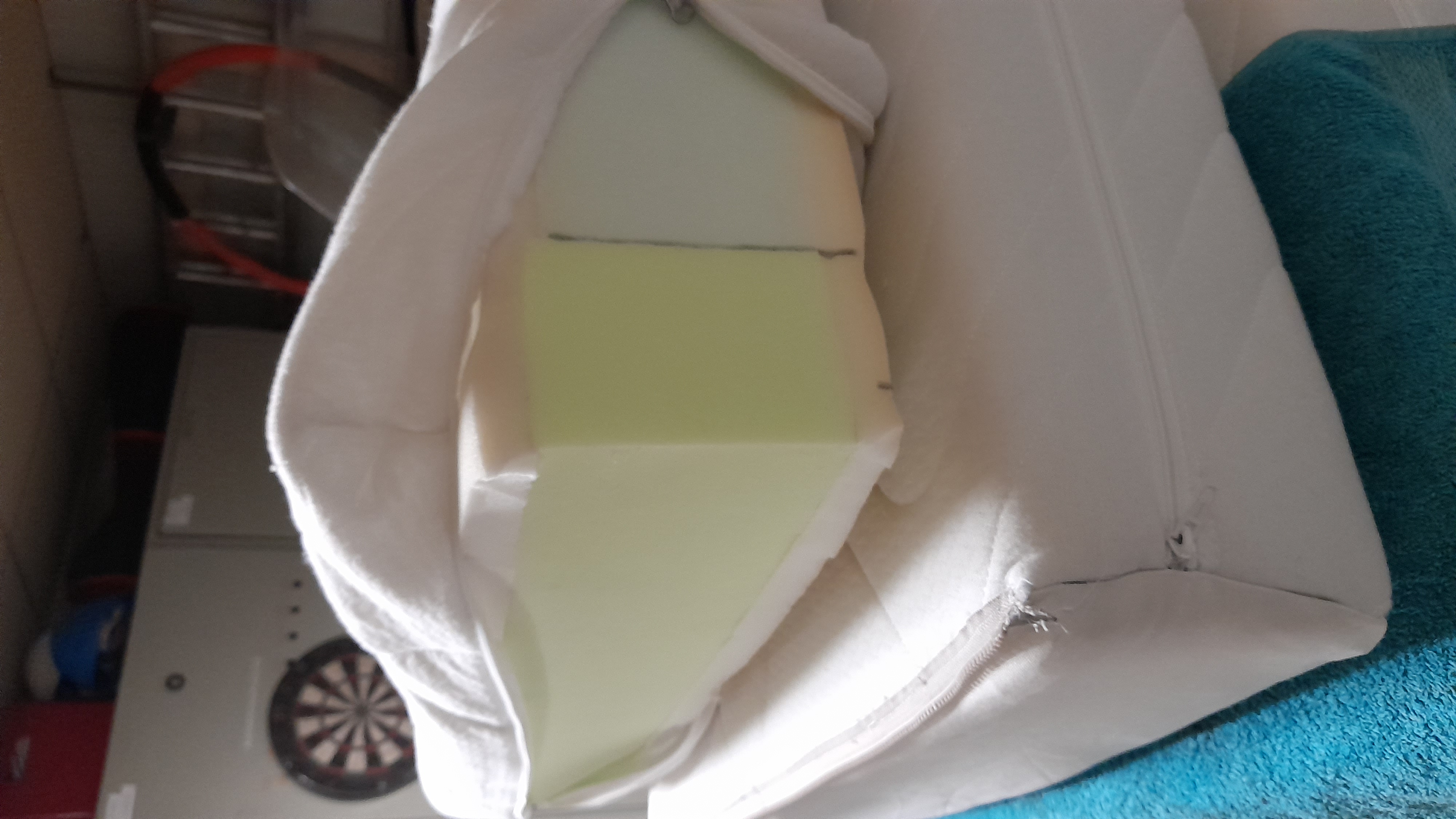 We hebben 2 pocketvering matrassen van 70x200 in de bus, maar door één matras te delen en een rits ertussen te plaatsen, kan het korte deel omklappen en vormt dit tevens een ruggesteun, er kan dan een zelfgemaakt stevig kussen van 70x40 op de bedbodem om op te zitten.