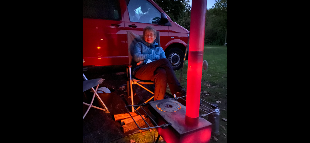 Ik heb een uitschuif tafeltje gemaakt. Met gedraaide voorstoelen heb je dan even wat meer afleg neerzet ruimte. Ingeschoven zit deze tussen de lattenbodem en de koelkast. Je ziet er ingeschoven bijna niets van. Je ziet alleen het zwarte elastiek.