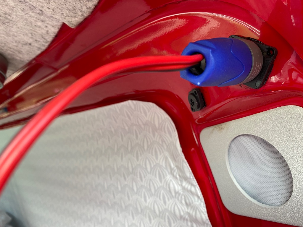 Allereerst de achter speakers. Ik dacht eerst aan kleine opbouw speakers. Dit ivm met zicht achteruit en ons slaapcomfort. Maar die klinken niet en de tijdens je slaap wil je toch je kop niet stoten. Voor inbouw speakers is er te weinig inbouw diepte en om nu in de Dstijl te zagen leek mij niet handig. Kortom ik heb nu waterbestendige van Magnat. Die zet ik neer wanneer tijdens het koken of naar binnen gericht. Daar heb ik nu goede connectoren voor gevonden. Eerder met ouderwetse speaker pluggen had ik geen succes. Dit zijn SpeakON chassisdeel en Neutrik NL2FX 2-polige speakonplug.