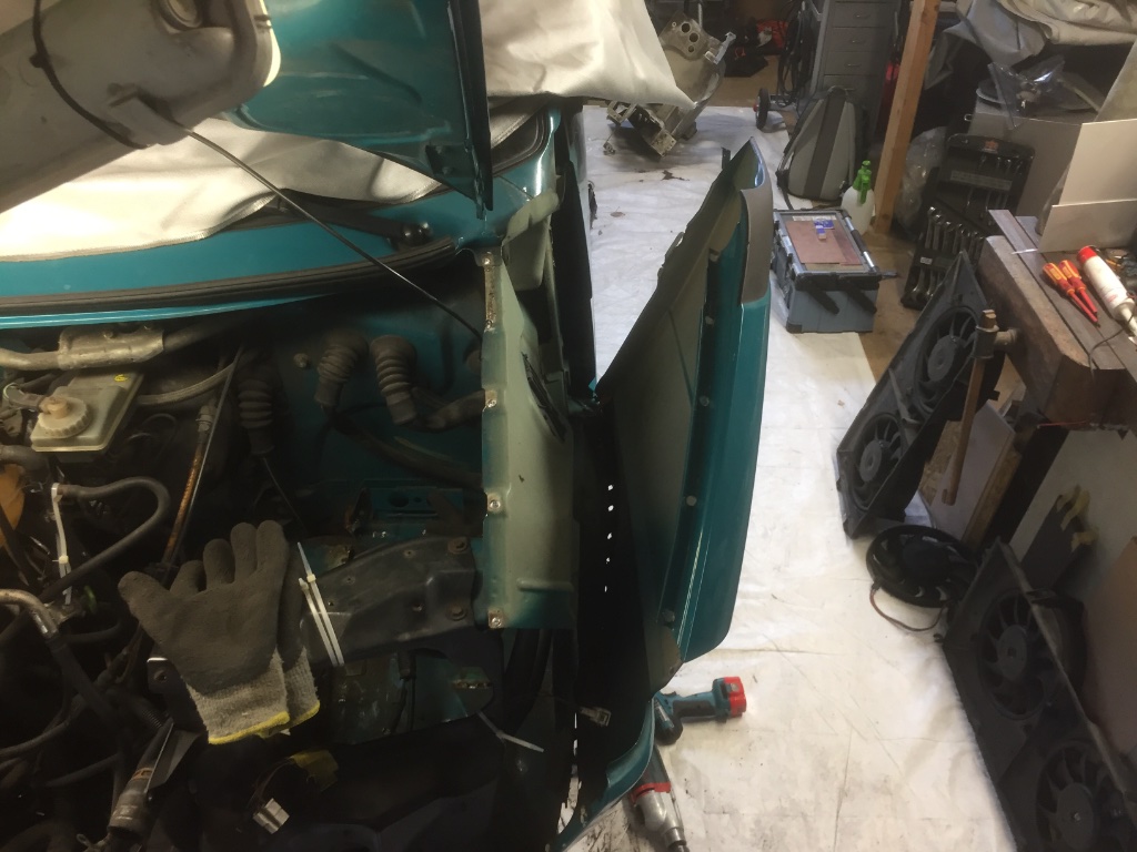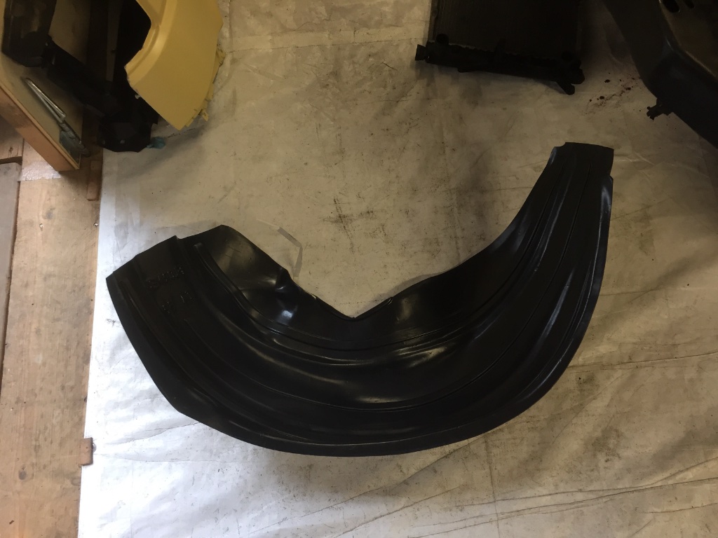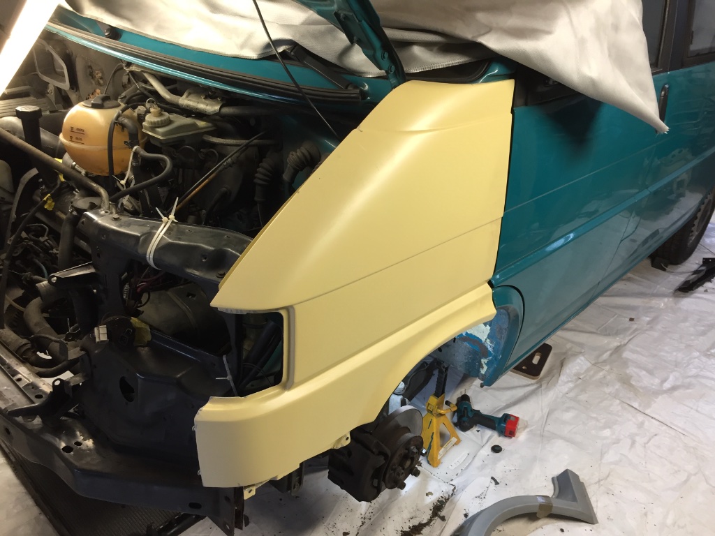 Proefpassen met het nieuwere spatbord. Dit van Pascal afkomstige deel stond al heeeeeel erg lang klaar op mijn zoldertje. Samen met het bevestigingsmateriaal en twee hoekstukken voor de bevestiging aan de deurzijde.