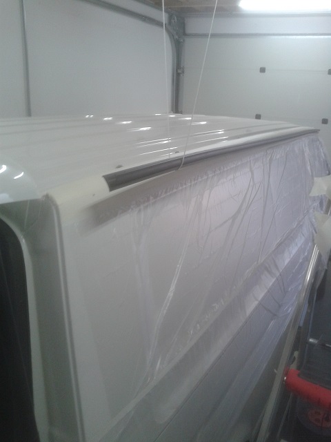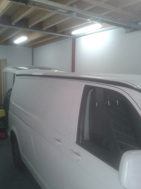 Vervolgens de bus afgeplakt en schilders tape aangebracht om beschadigingen tijdens het passen en meten tegen te gaan, de achter zijde van de rail heb ik eerst in een touwtje gehangen en daarna de voorkant op de juiste plaats vastgeplakt met tape, daarna touwtje los en achter vastplakken. Uit de beschrijving van Reimo blijkt dat het spoilertje aan de voorkant net op de ruit moet uitkomen, door het buigen van het flexibele spoilertje kan de rails er op meerdere manieren op zodat ik het hele proces nog wel een paar keer herhaald heb, ook de rails is voorgebogen voor een T5 dus even zoeken hoe ook hij het mooist aansluit. Vervolgens het eerste gaatje afgetekend en de rails er af gehaald.