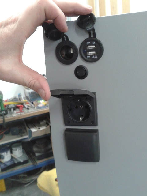 Zoals gezegd, hier de foto's van het keukenblokje. De rail voor het tafeltje zit er ook al op. De 12 volt aansluiting en de usb gaan via het 20 ampère schakelaartje met controle ledje bij aan.