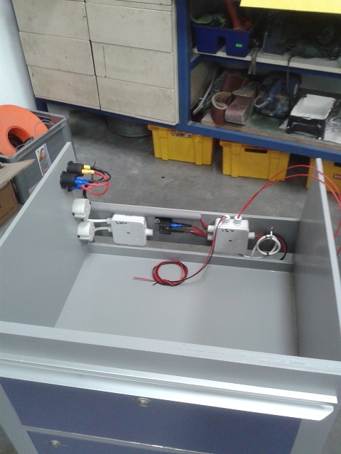 En weer verder bezig geweest, in de kast voor links achter led verlichting gemaakt zodat je makkelijk alles kan vinden en het keuken blokje voorzien van de deurtjes met slotjes en de 230 en 12 volt aansluitingen en voeding voor het waterpompje (via relais) en aansluiting voor de elektrische ontsteking van het kooktoestel. Die Origo A100 is overigens nog steeds niet leverbaar zodat ik met het blad nog niet verder kan. Ook nog even 2 fotootjes van dat eerder genoemde schroefluikje, kost 6,95 euro.