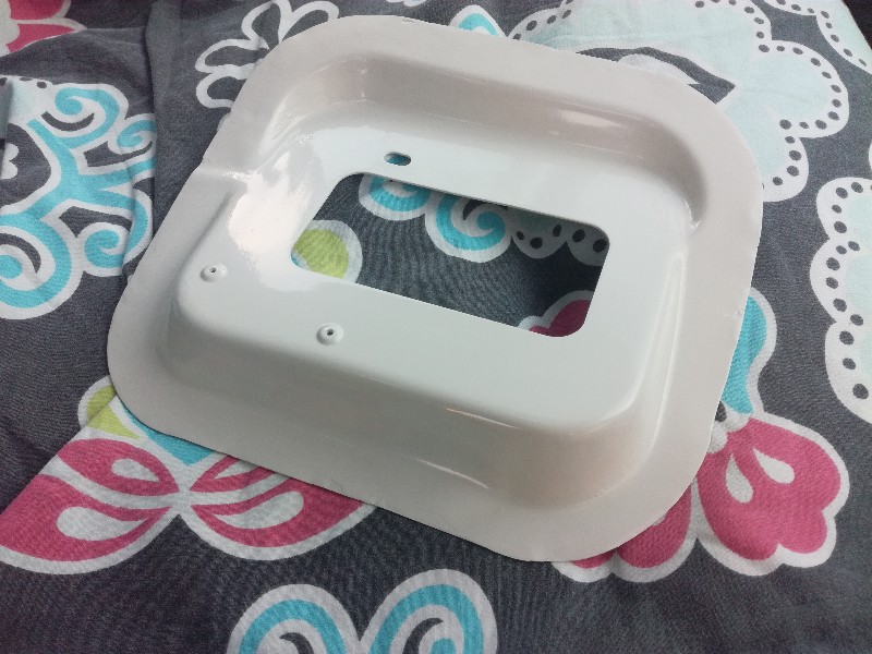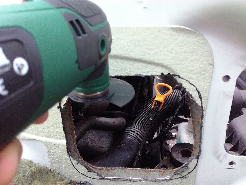 Weer wat verder... Dit is het stuk schutbord waar de doorvoer opzit die in mijn bus moet komen. Het scheiden van beide delen was nog een best klusje, de doorvoer zit met carrosseriekit vast en is ook nog deels gelast. Met hulp van haakse slijper, verfbrander en een beitel lukte het.