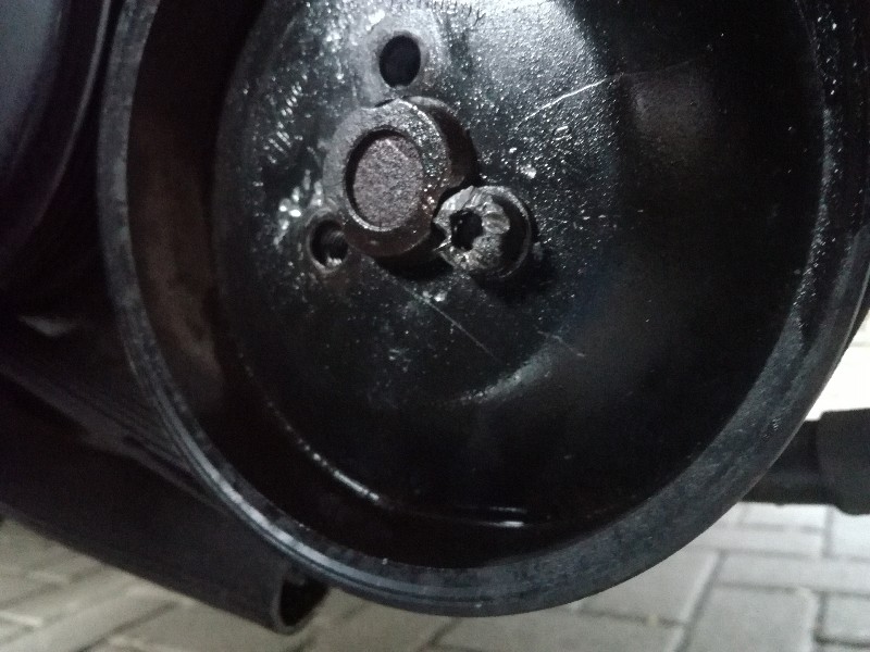 Eerst de poelie die in de weg zit eraf halen. Daar wachtte een "leuke" verrassing: de inbusboutjes van de poelie waren door een voorganger dolgedraaid. Verkeerde bezuinigingen, die boutjes kosten samen nog geen knaak bij de dealer...