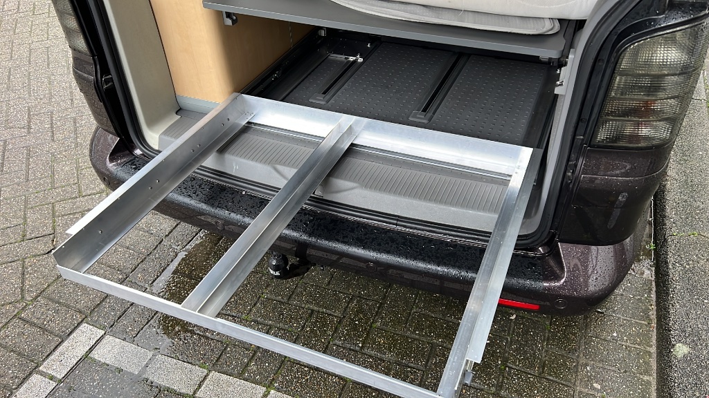 Door de bevestiging aan de rails van de busvloer onder de lade zelf in te passen kan de lade over de bevestigingen heen schuiven en hoeft de bank minder ver naar voren :)