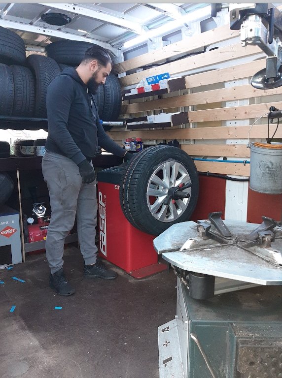 De banden worden in de bus gewisseld en gebalanceerd voor montage.