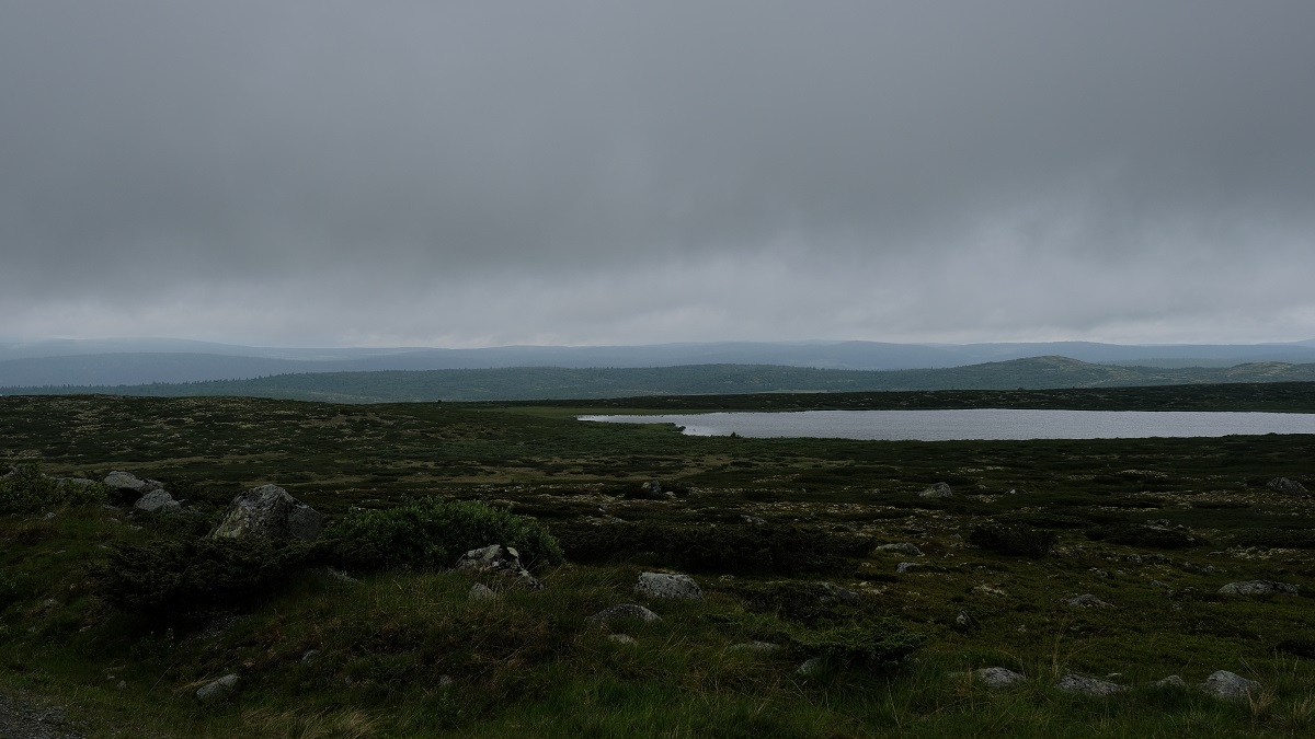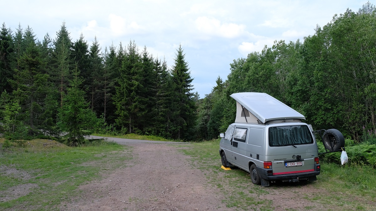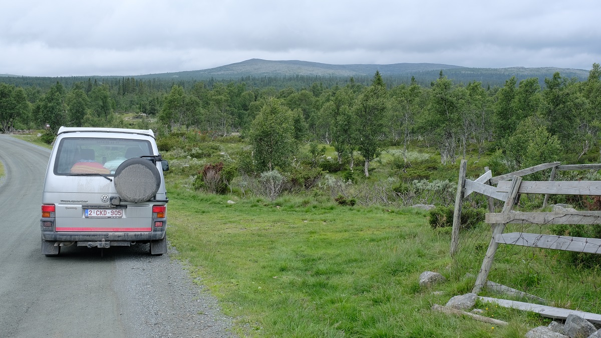 Te Elverum waren we het al beu om door elkaar gerammeld te worden en zijn we via geasfalteerde kronkelwegen richting Birkerbeinervegen gereden. Dat waren behoorlijk wat kilometers, en helaas waren we op een lange saaie weg terecht gekomen, met links een rivier en spoorlijn, en rechts een "bergrug" zonder wegen. Kort voor Evenstad vonden we eindelijk een rustig plaatsje voor de nacht. Bleek dat enkele honderden babypadjes en een paar duizend muggen daar ook logeerden. En de regenwolken ook.
