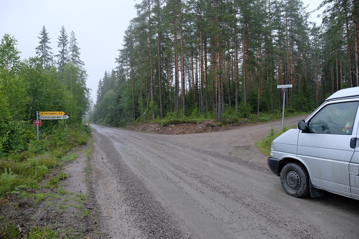 Na het kerkhof, waar tussendoor ook een Unimog en een Bremah 4x4-monster gearriveerd waren, zijn we doorheen de regen rustig verder gekabbeld, noordwaarts, doorheen Zweden, naar het punt waar de Noorse sectie van de TET begint, ten oosten van Øyermoen.