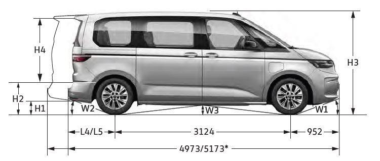 De California is op basis van de Multivan met lange overhang, lengte is 5,17m. De T5/6 California is 4,90m.