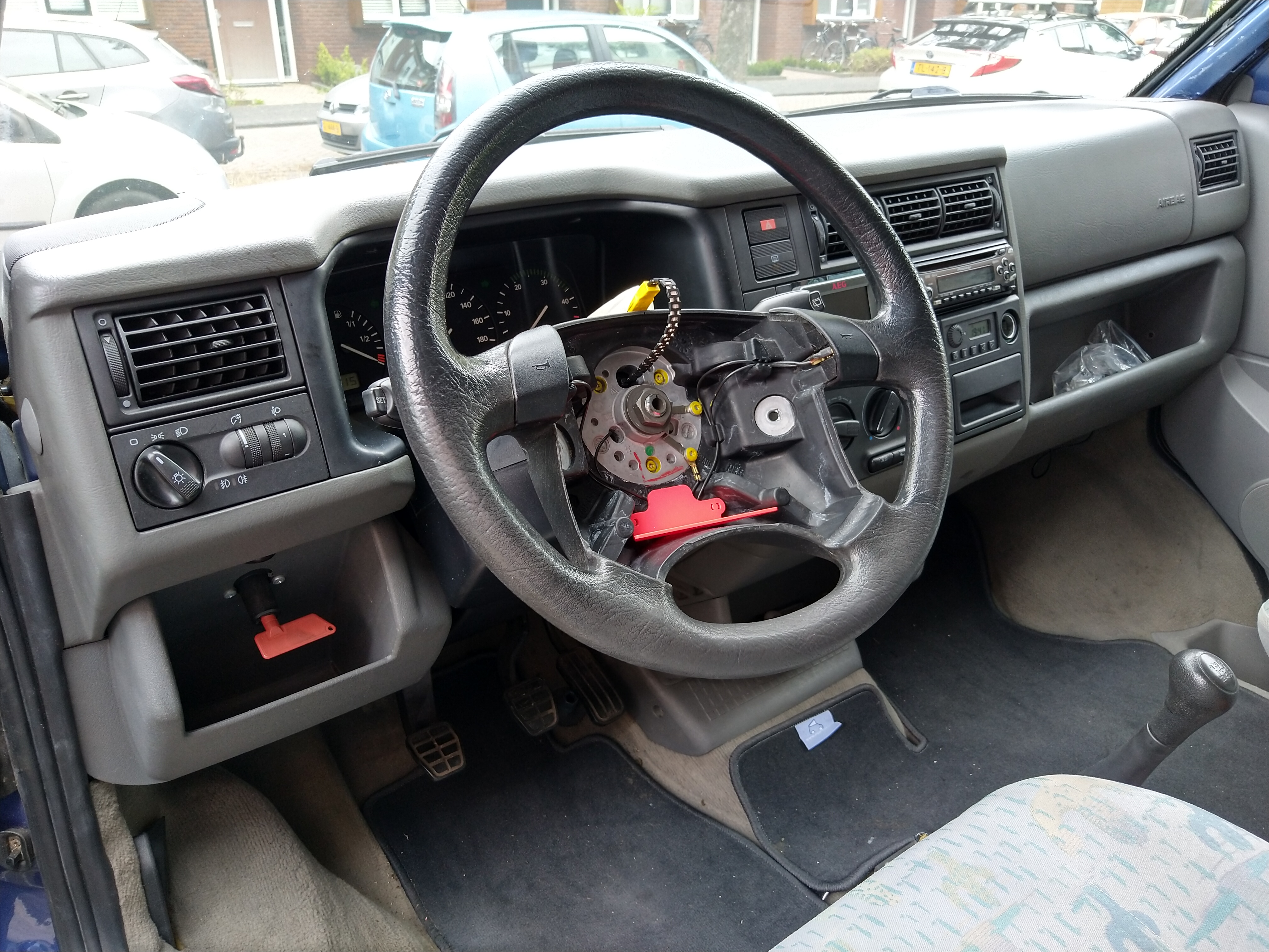 Ook nog een foto met de airbag eruit. Als je dan de centrale moer los draait komt het stuur als één geheel van de stuurstang.
