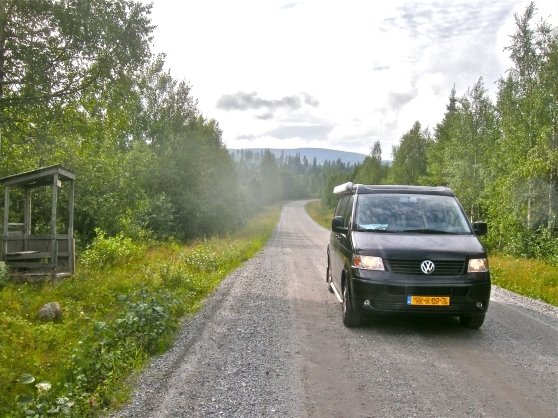 Op de oneindige steenslagwegen van Zweeds Lapland. Je rijdt zo een uur zonder ook maar iemand tegen te komen.