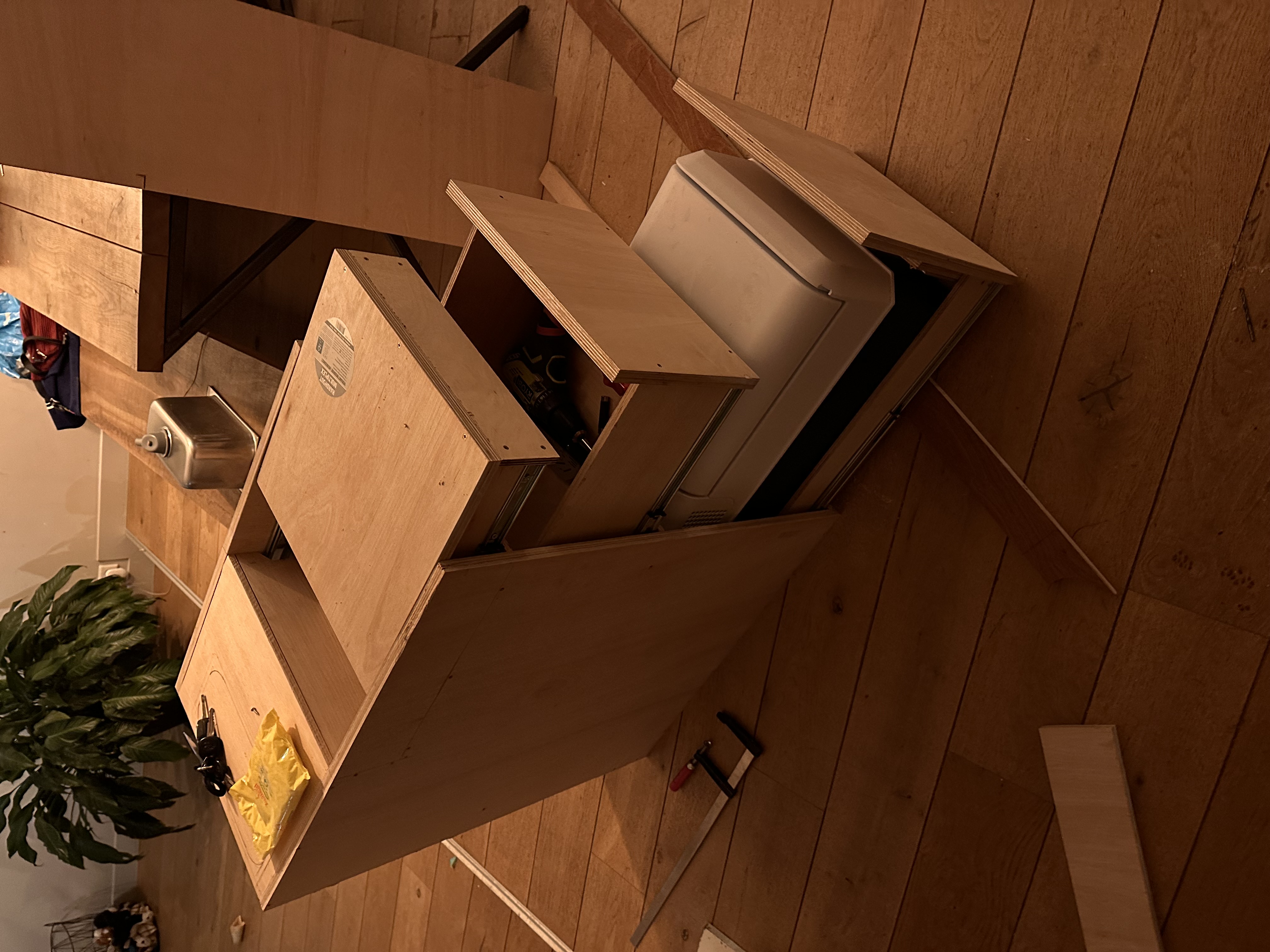 Dat is een mooi stukje huisvlijt. Ik neem aan dat de kookpitten in de bak onder het uitschuifgedeelte komen. Maar als dit helemaal uitgeschoven is en je bent aan het koken, kan je dan nog iets uit de bovenste lade pakken?