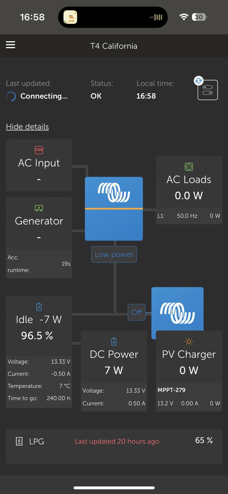 Het VRM overzicht van victron is daarnentegen wel erg mooi en handig qua bediening, alleen het nadeel is dat je dat alleen kunt gebruiken als je Cerbo over internet beschikt, en dat is alleen als hij in mijn schuur staat. Wat fijn is is dat ik hem aan de lader kan zetten in mijn schuur en dan kan zien welke temperatuur alles is en hoe de status is en dat ik de oplader op afstand kan aan/uit schakelen.