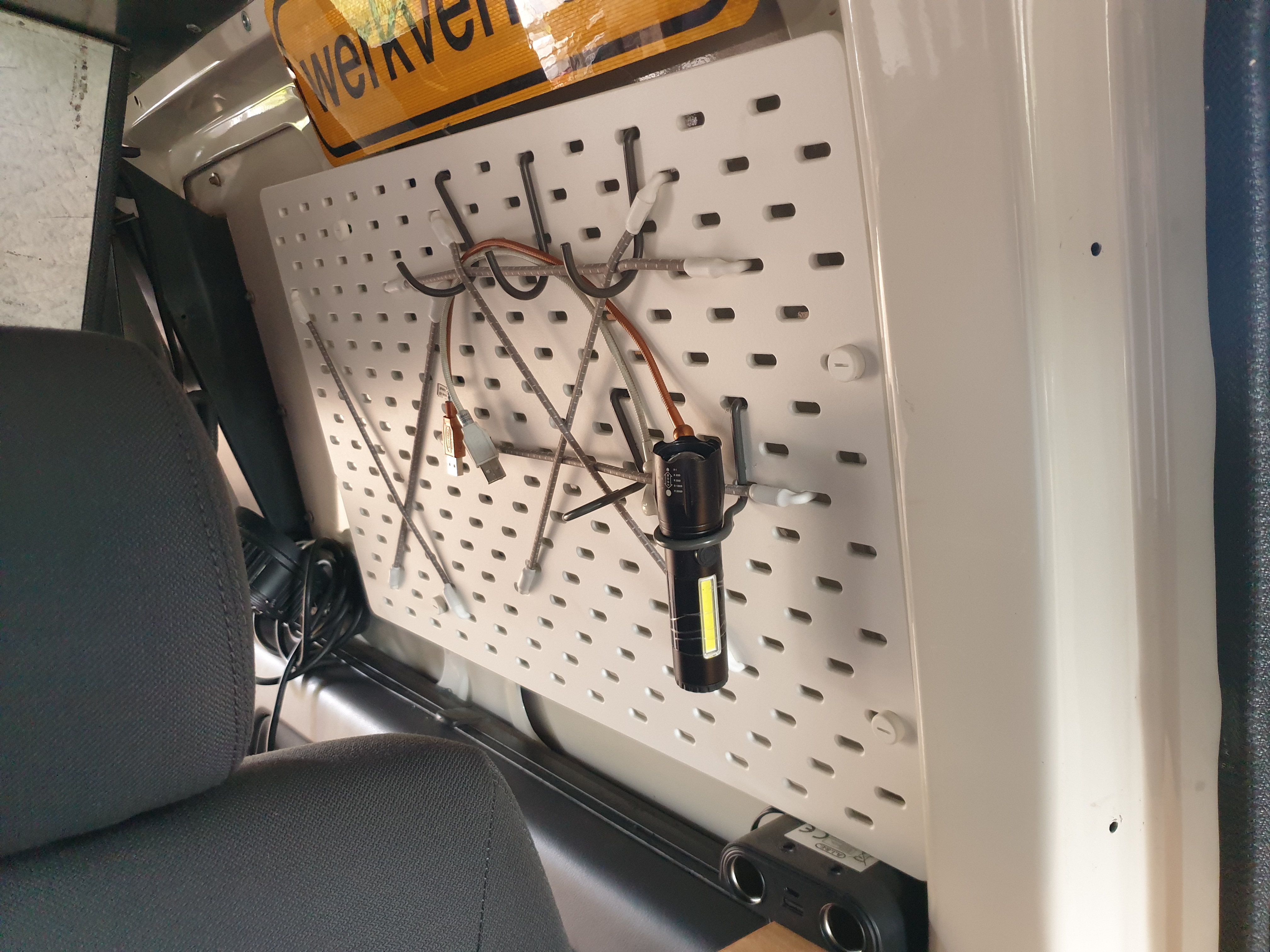 Ik ben toch van ander hout gesneden dan zo'n kant en klare doos. Dat wandrekje achterin heb ik van ikea aan beide zijden. En lekker metaal van de bus rondom plakken de magneetborden, lampen en accessoires goed op.