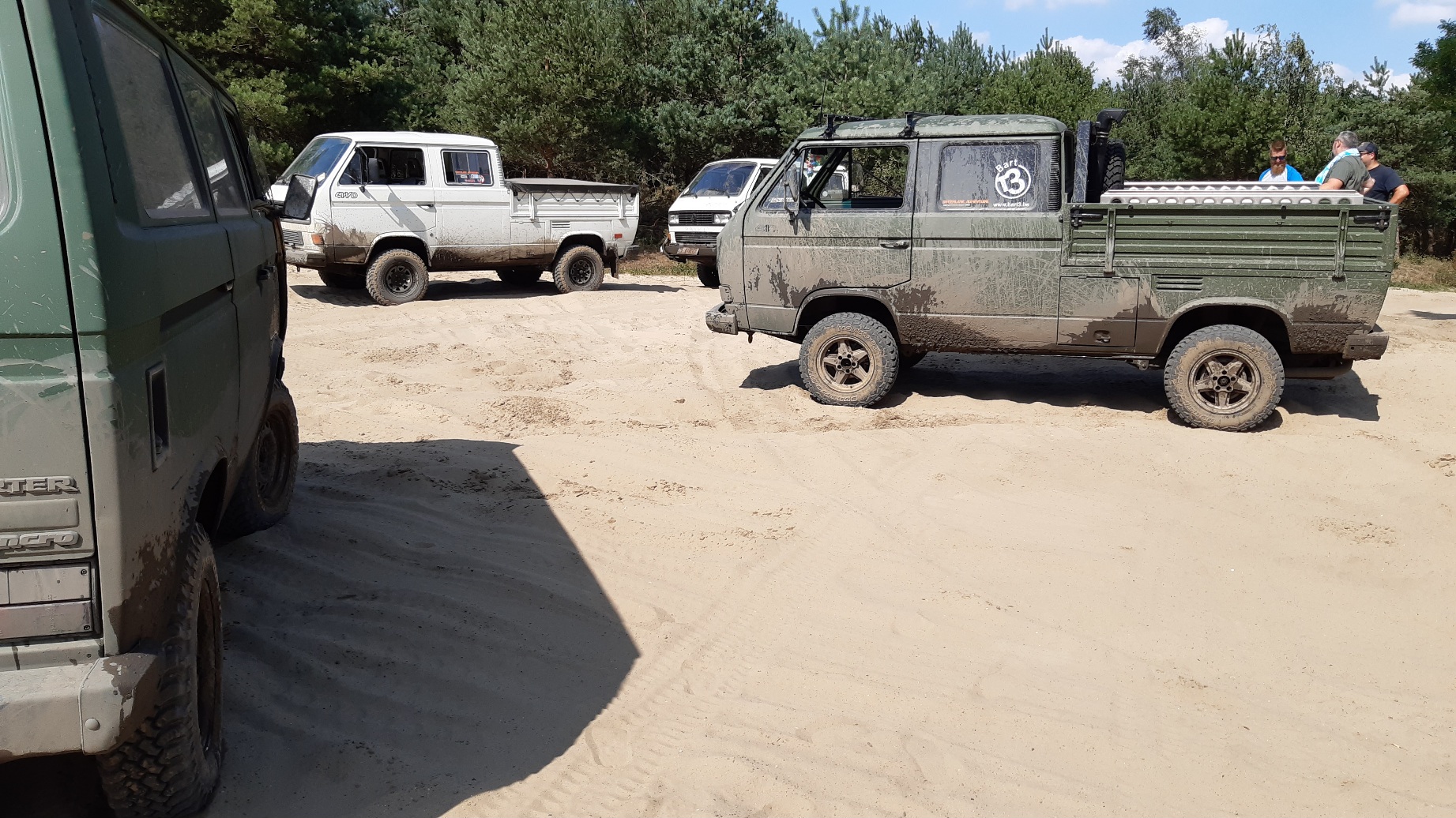 Deze T3 Syncro hadden we ook snel klaargemaakt om mee te nemen naar Fursten Forest . Afgeschuurd , gelakt in kaki , mechanisch in orde gemaakt , luchtfilter naar binnen gebracht en onder het dak bevestigd (voor de diepe water doorwadingen) , en ook zelf een bodembeschermplaat/frame gemaakt En ik heb met mijn Syncro daar ook een Unimog losgetrokken die goed vastgereden was