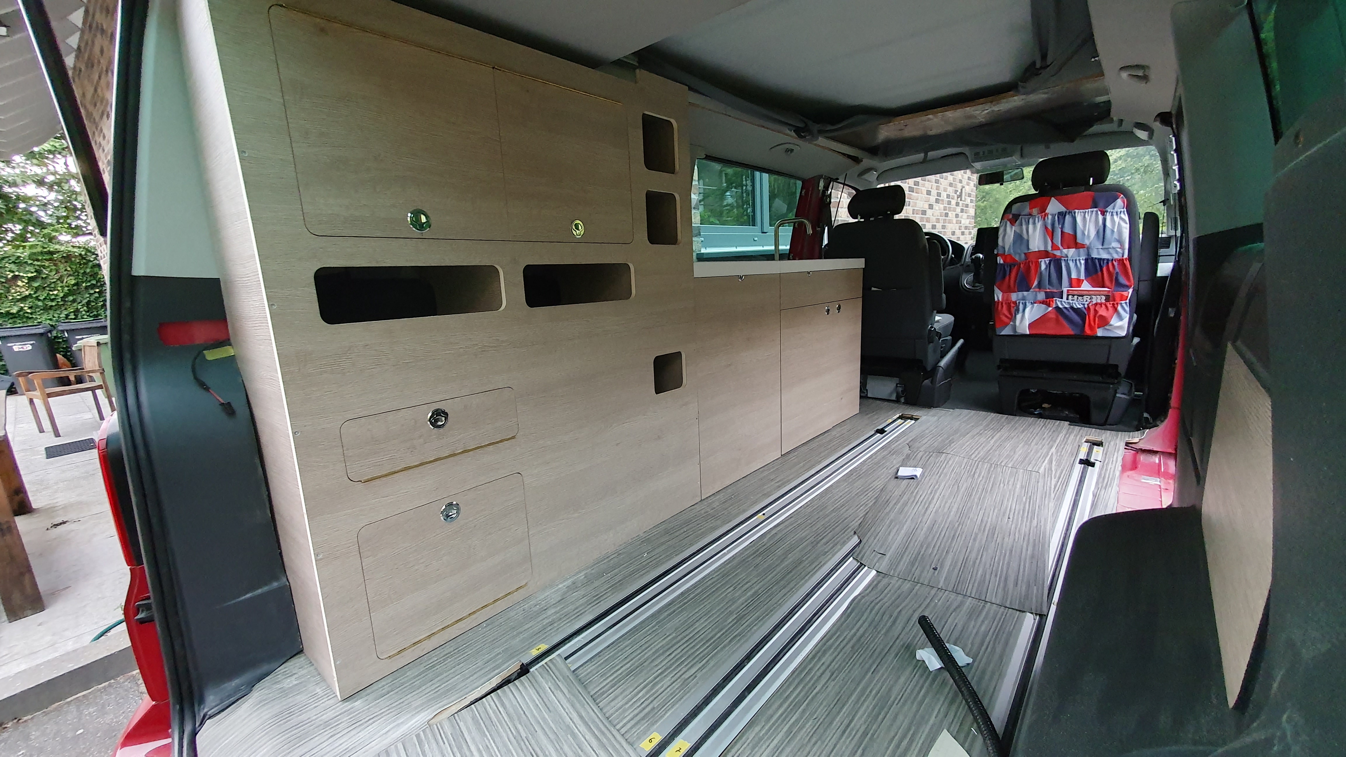 Verder is de indeling zo gemaakt dat we de diepte achter de multivan panelen ook zo veel mogelijk gebruiken, daarom is de multitool in de 2 multivan zijpanelen gezet. Daarmee pakken we op sommige plaatsen bijna 11 cm extra diepte.. Daardoor konden lades dieper gemaakt worden om extra ruimte te genereren.