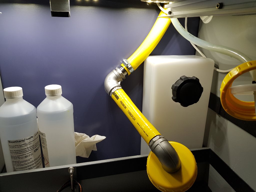 Intussen de bus uitgepakt alle bedegoed en kleding in de was en porta potti en watertankjes leeg. Dit is al het vuile water uit de gootsteen van bijna 4 weken met ons kampeer gedrag. IK wist al dat het weinig zou zijn van voorgaande tripjes en had al een nieuw en heel klein tankje besteld. Deze nu nog inbouwen met een aftap onder de auto. scheelt gelijk plek in het keukenkastje zodat daar mooi andere spulletjes kunnen staan of, indien nodig, extra water. Groeten,